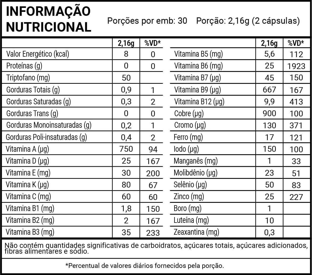 Óleo de coco, magnésio bisglicinato, óleo de borragem, óleo de prímula, zinco bisglicinato, azeite de oliva, ferro bisglicinato, ascorbato de cálcio, L-triptofano, luteína da flor de Tagetes erecta, D-alfa tocoferol, nicotinamida, fosfato de piridoxal, D-pantenol, tetraborato de sódio decahidratado, cobre bisglicinato, selenometionina, menaquinona-7 (vitamina K2), palmitato de retinol, riboflavina-5'-fosfato de sódio, cloridrato de tiamina, picolinato de cromo, sulfato de manganês monohidratado, L-metilfolato de cálcio, iodeto de potássio, D-biotina, fitomenadiona (vitamina K1), colecalciferol, molibdato de sódio dihidratado, metilcobalamina e emulsificante lecitina de girassol.Composição da Cápsula: Gelatina, água purificada, umectante glicerina e corante natural clorofila.