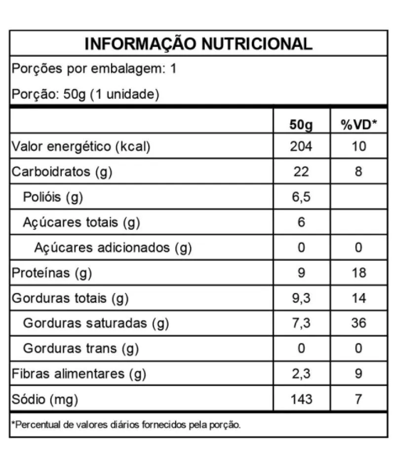Ingredientes: Cobertura sabor brigadeiro proteica, gordura vegetal, amido de mandioca, leite desnatado em pó, proteína concentrada do soro de leite, maltitol, grânulos crocantes sabor