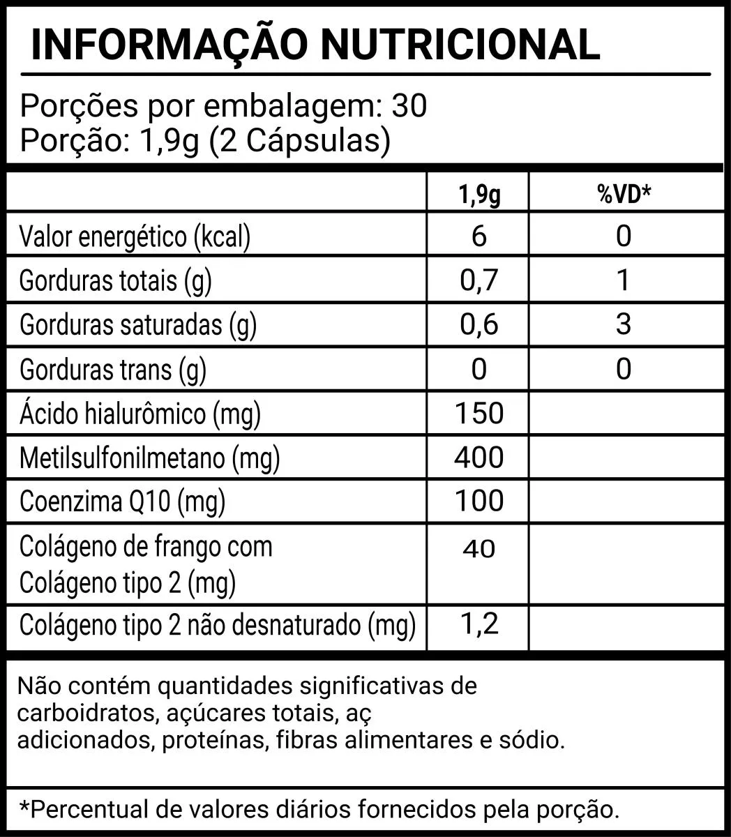 - Combina ingredientes premium como colágeno tipo II, ácido hialurônico, MSM e coenzima Q10.