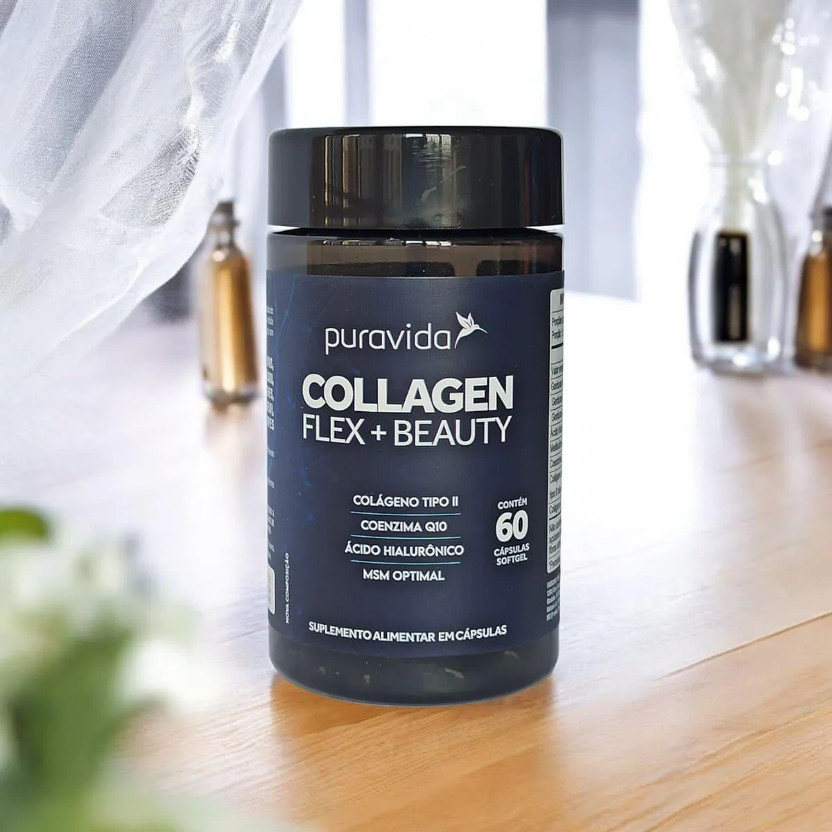 O Collagen Flex Beauty é um suplemento alimentar premium que combina colágeno tipo II não desnaturado, ácido hialurônico, metilsulfonilmetano (MSM) e coenzima Q10. Seu objetivo é promover a saúde das articulações e melhorar a beleza da pele, cabelos e unhas, oferecendo nutrientes essenciais para o bem-estar diário.