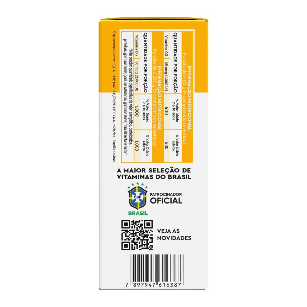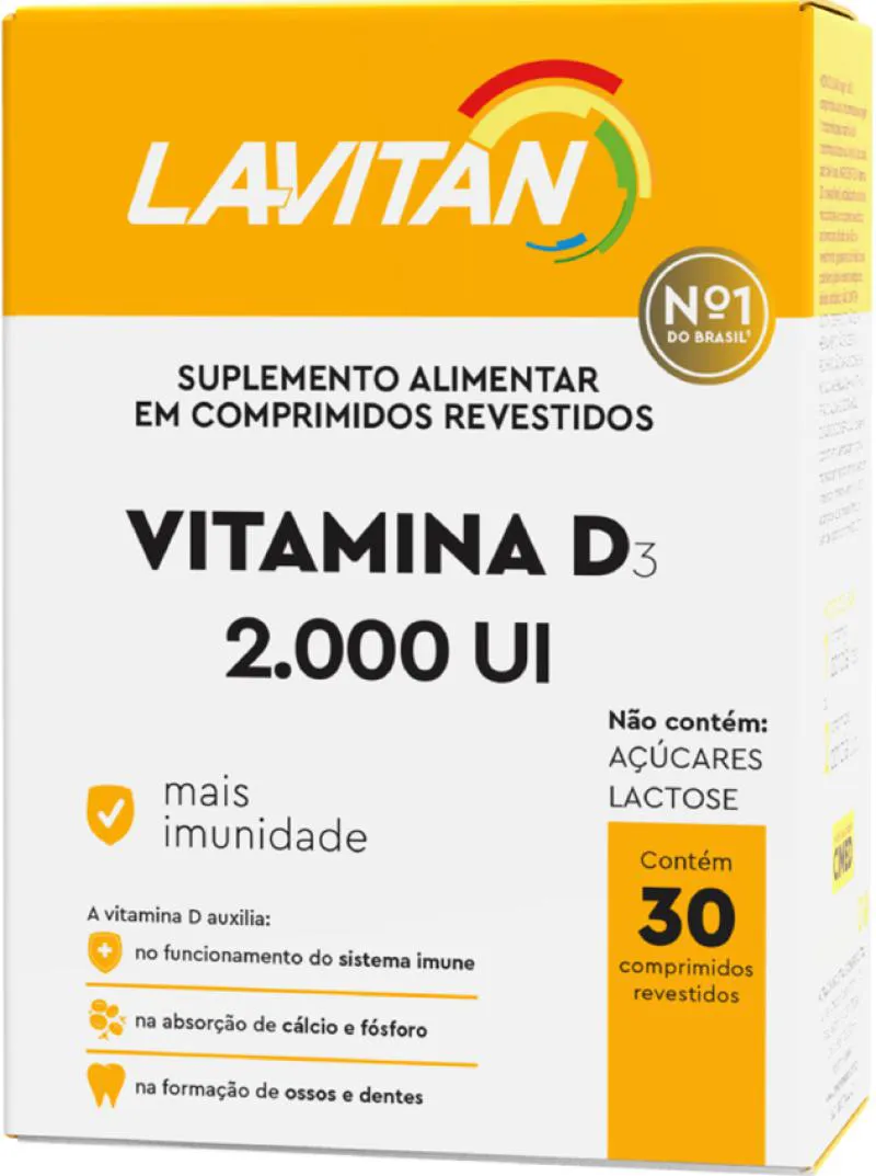 Suplemento Alimentar em comprimidos revestidos composto por vitamina D. Cada comprimido possui 2000 UI, auxiliando na absorção de cálcio e fósforo e no funcionamento do sistema imune. Indicado para adultos e crianças acima de 7 anos.