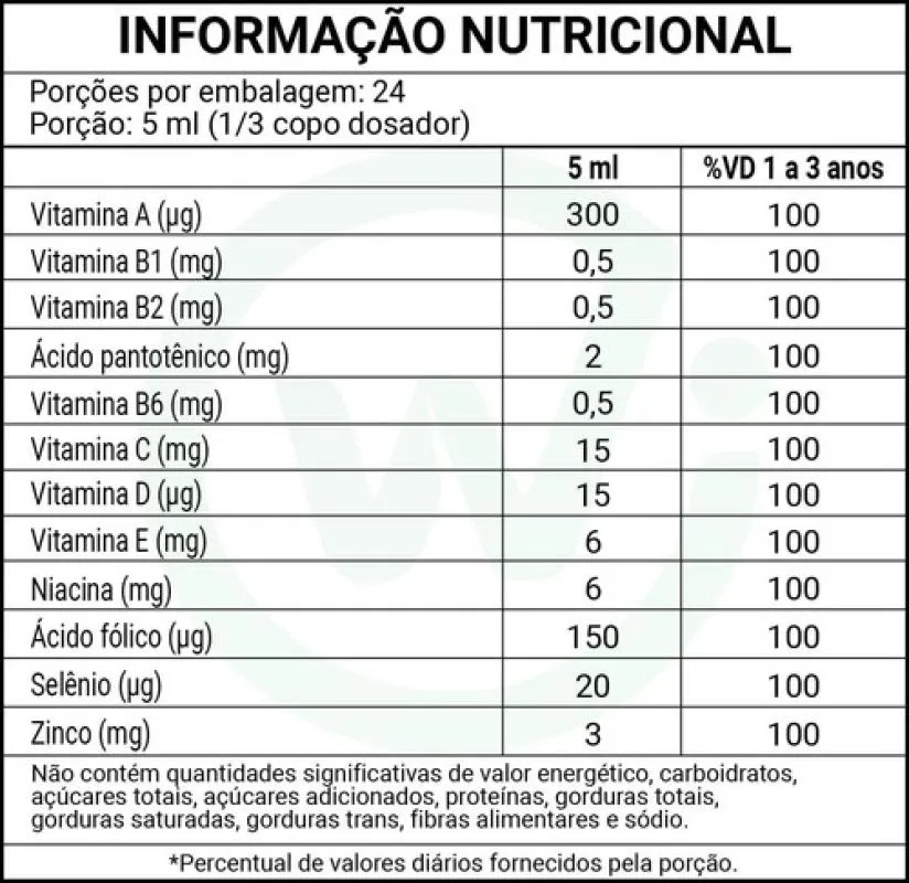 Ácido ascórbico (vitamina c), acetato de alfa-tocoferol (vitamina e), nicotinamida (niacina), bisglicinato de zinco, D-pantotenato de cálcio, mononitrato de tiamina (vitamina B1), riboflavina (vitamina B2), cloridrato de piridoxina (vitamina B6), acetato de retinol (vitamina A), colecalciferol (vitamina D3), ácido fólico, selenito de sódio, glicerina vegetal, água purificada, goma guar (INS 412), aroma natural de Uva.Informações Importantes