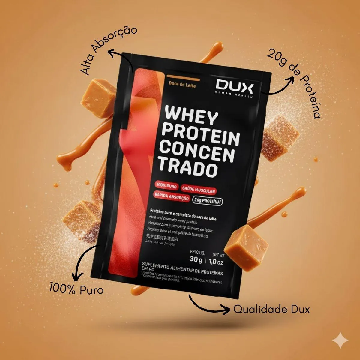 KIT 6 SACHE whey protein CONCENTRADO DUX DOCE DE LEITE 20G PROTEINA ALTA ABSORÇÃO FORÇA O Whey Protein Concentrado DUX, sabor DOCE DE LEITE, é a escolha PREMIUM para sua nutrição com um toque de sobremesa. Cuidadosamente extraído do soro do leite, este blend exclusivo fornece 20G de PROTEINA 100% pura por dose. Ideal para quem busca máxima FORÇA, ALTA ABSORÇÃO e PERFORMACE PARA O TREINO com um sabor irresistível. O WHEY CONCENTRADO DUX: PUREZA E PERFORMACE PARA O TREINO O DUX Concentrado DOCE DE LEITE é um SUPLEMENTO selecionado, essencial para a construção ou manutenção da massa muscular. É um produto de marca reconhecida pela qualidade: PROTEINA PURA: 20G de PROTEINA por porção, extraída diretamente do soro do leite, sem blends ou adição de proteínas de menor valor biológico. ALTA ABSORÇÃO: Passa por rigoroso processo de filtragem, tornando-se uma fonte altamente absorvível de aminoácidos. Perfil Completo: Possui aminoácidos essenciais, cruciais para a construção do MUSCULO, a RECUPERAÇÃO rápida e a manutenção da massa magra. Sabor DELICIOSO: O toque de DOCE DE LEITE torna o consumo um prazer, ideal para quem ama cuidar do corpo e da mente. A PROTEÍNA É O ALICERCE DA FORÇA E DA ENERGIA A proteína é um nutriente essencial para a construção e reparação das células do corpo. O Whey Protein Concentrado fornece suporte significativo para o ganho de massa muscular e o desempenho. SUPORTE ENERGÉTICO: Sua fórmula balanceada fornece ENERGIA equilibrada, ideal para o consumo antes e depois dos treinos. RECUPERAÇÃO: O perfil completo de aminoácidos contribui para uma RECUPERAÇÃO mais eficaz do MUSCULO. PRATICIDADE: FÁCIL DE PREPARAR E CONSUMIR no dia a dia, sendo um lanche SAUDÁVEL e rápido. SUGESTÕES DE USO PARA GANHO MÁXIMO DE FORÇA O sabor DOCE DE LEITE é versátil, ideal para ser misturado em receitas ou simplesmente com água/leite: PÓS-TREINO: A melhor hora para otimizar a RECUPERAÇÃO muscular. CAFÉ DA MANHÃ: Para começar o dia com o aporte proteico necessário. LANCHE: Opção deliciosa e rica em PROTEINA no meio do dia. Prepare com água, leite, frutas ou adicione em suas receitas favoritas. Consumir junto com alimentos para facilitar sua assimilação e maximizar a ALTA ABSORÇÃO. CARACTERÍSTICAS TÉCNICAS Tipo de Produto: WHEY PROTEIN CONCENTRADO (SUPLEMENTO) Conteúdo: 1 SACHÊ (30G) Proteína por Dose: 20G Sabor: DOCE DE LEITE Diferenciais: Blend puro, perfil completo de aminoácidos. ESTOQUE LIMITADO! Garanta o seu WHEY DUX DOCE DE LEITE agora e sinta a diferença na sua FORÇA e ENERGIA. Aproveite o preço especial! Aviso legal Este produto é um SUPLEMENTO dietético, não um medicamento. Suplementa dietas insuficientes. Consulte o seu médico e/ou farmacêutico.
