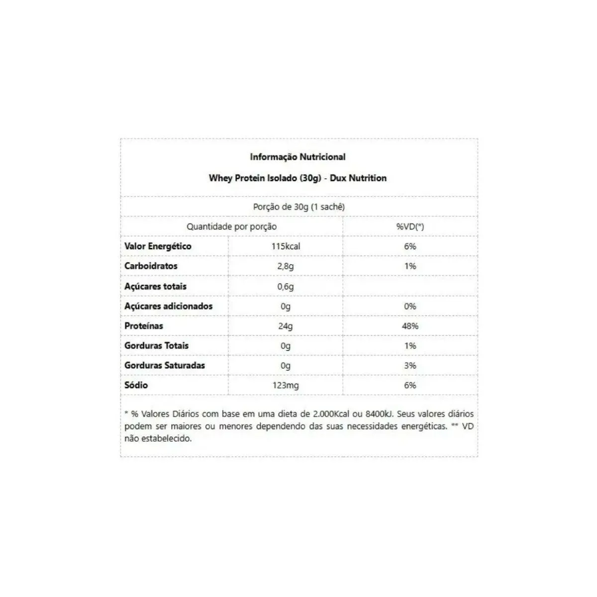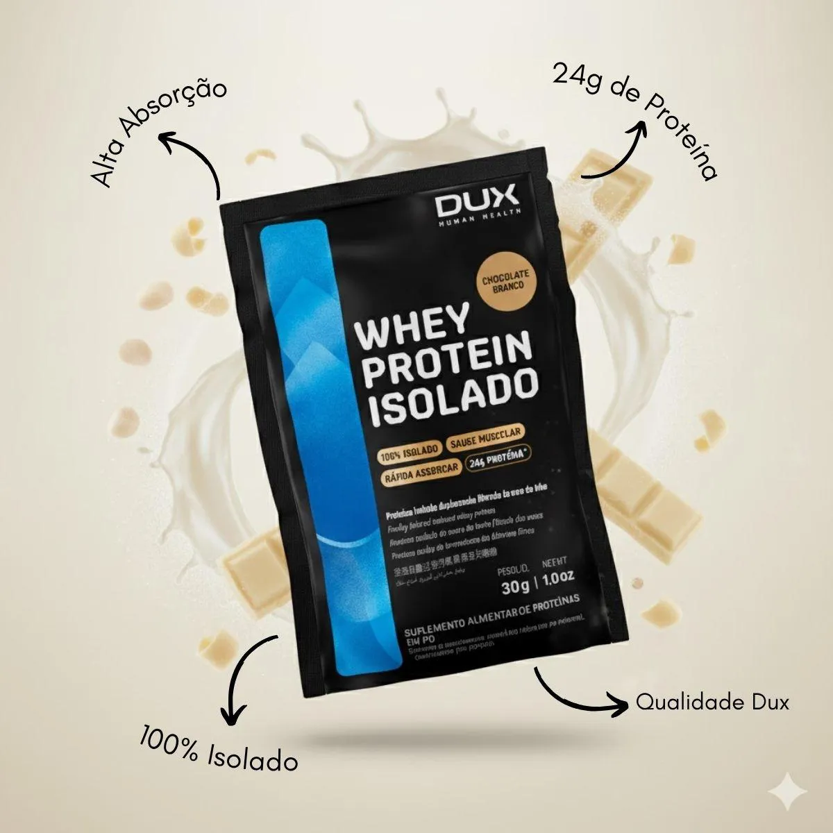 KIT 6 SACHE whey protein ISOLADO DUX chocolate BRANCO 24G PROTEINA ZERO LACTOSE FORÇA Descubra o poder da PROTEINA ISOLADA mais pura do mercado, agora no sabor irresistível de CHOCOLATE BRANCO. O WHEY ISOLADO DUX é a escolha perfeita para quem busca ALTA PERFORMACE sem abrir mão de um sabor delicioso. Com 24G de PROTEINA por dose, garante máxima FORÇA, ALTA ABSORÇÃO e recuperação inigualável. O ISOLADO DUX: PUREZA PARA RESULTADOS RÁPIDOS O DUX Isolado CHOCOLATE BRANCO é o SUPLEMENTO PREMIUM que você precisa para elevar sua PERFORMACE PARA O TREINO. O sabor, que remete a uma sobremesa, quebra o mito do gosto artificial dos suplementos. 24G DE PROTEINA: Teor proteico elevadíssimo por porção (SACHÊ de 30G), essencial para o desenvolvimento do MUSCULO. ZERO LACTOSE: Extremamente baixo teor de lactose (quase zero), ideal para intolerantes ou quem busca digestão mais leve. ALTA ABSORÇÃO: Matéria-prima IMPORTADA e tecnologia avançada de filtração, garantindo altíssimo grau de pureza. Perfil Completo: Possui aminoácidos essenciais, bcaa's e glutamina, cruciais para a RECUPERAÇÃO e crescimento do MUSCULO. ZERO GORDURA E CARBOIDRATO: Processo de filtração avançado que remove a maior parte destes componentes. COMO CONSUMIR ESTE WHEY PROTEIN ISOLADO CHOCOLATE BRANCO? Para quem busca ALTA PERFORMACE, a suplementação deve ser estratégica e consistente. Misture 1 SACHÊ (30G) em 200 a 300ml de água ou bebida de sua preferência. Agite bem para garantir completa dissolução. SUGESTÕES DE USO PARA GANHO MÁXIMO DE FORÇA E ENERGIA: PÓS-TREINO: O momento chave para RECUPERAÇÃO e crescimento do MUSCULO. AO ACORDAR: Forneça PROTEINA de ALTA ABSORÇÃO imediatamente. ENTRE REFEIÇÕES: Mantenha o aporte proteico e a saciedade ao longo do dia com este SUPLEMENTO delicioso. DICA EXTRA: O sabor CHOCOLATE BRANCO é versátil para ser adicionado em receitas de doces saudáveis e shakes. É FÁCIL DE PREPARAR E CONSUMIR no dia a dia. CARACTERÍSTICAS TÉCNICAS Tipo de Produto: WHEY PROTEIN ISOLADO (SUPLEMENTO) Conteúdo: 1 SACHÊ (30G) Proteína por Dose: 24G (Aproximadamente) Sabor: CHOCOLATE BRANCO Diferenciais: ZERO LACTOSE (Baixíssimo teor), ZERO GLÚTEN, ZERO AÇÚCAR. APOSTE em quem entende do assunto. Aqui você encontra apenas produtos 100% originais, com garantia de qualidade e confiança. ESTOQUE LIMITADO! Garanta o seu WHEY DUX ISOLADO CHOCOLATE BRANCO agora e sinta a diferença na sua FORÇA e ENERGIA! Aviso legal Este produto é um SUPLEMENTO dietético, não um medicamento. Suplementa dietas insuficientes. Consulte o seu médico e/ou farmacêutico.