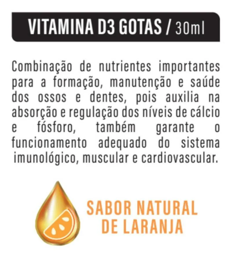 A Vitamina D3 Gotas 2000UI é um suplemento nutricional líquido que fornece vitamina D3 de forma prática e fácil de consumir. Desenvolvido com sabor natural de laranja, o produto contém colecalciferol e é isento de glúten.