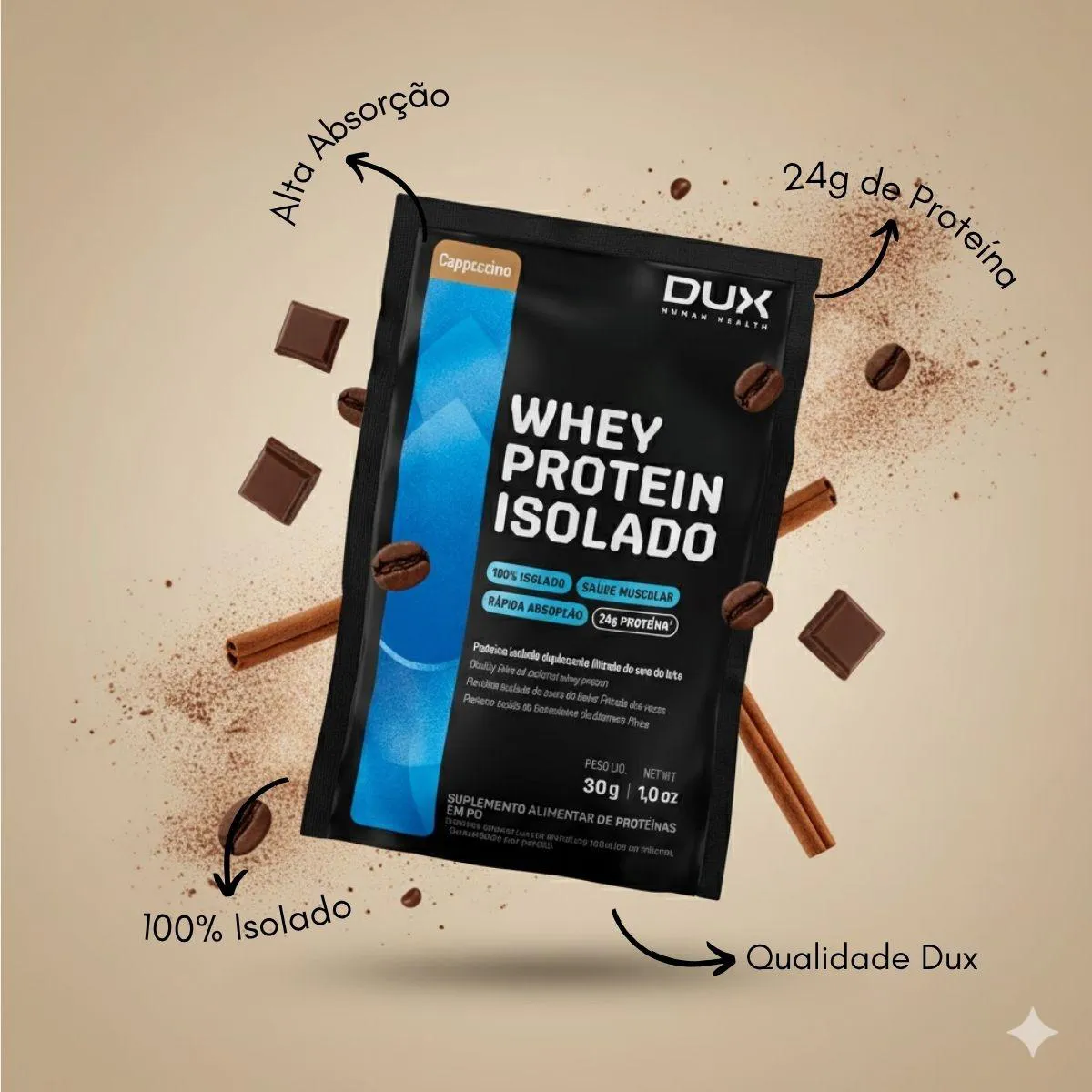 KIT 6 SACHE whey protein ISOLADO DUX CAPPUCCINO 24G PROTEINA ALTA ABSORÇÃO FORÇA Descubra o poder da PROTEINA ISOLADA mais pura do mercado, agora no sabor sofisticado de CAPPUCCINO. O WHEY ISOLADO DUX é a escolha perfeita para quem busca ALTA PERFORMACE com o prazer de uma bebida quente e saborosa. Com 24G de PROTEINA por dose, garante máxima FORÇA, ALTA ABSORÇÃO e recuperação inigualável. O ISOLADO DUX: PUREZA PARA RESULTADOS RÁPIDOS O DUX Isolado CAPPUCCINO é o SUPLEMENTO PREMIUM que você precisa para elevar sua PERFORMACE PARA O TREINO. O sabor, que combina café e cremosidade, quebra o mito do gosto artificial dos suplementos. 24G DE PROTEINA: Teor proteico elevadíssimo por porção (SACHÊ de 30G), essencial para o desenvolvimento do MUSCULO. ZERO LACTOSE: Extremamente baixo teor de lactose (quase zero), ideal para intolerantes ou quem busca digestão mais leve. ALTA ABSORÇÃO: Matéria-prima IMPORTADA e tecnologia avançada de filtração, garantindo altíssimo grau de pureza. Perfil Completo: Possui aminoácidos essenciais, bcaa's e glutamina, cruciais para a RECUPERAÇÃO e crescimento do MUSCULO. ZERO GORDURA E CARBOIDRATO: Processo de filtração avançado que remove a maior parte destes componentes. COMO CONSUMIR ESTE WHEY PROTEIN ISOLADO CAPPUCCINO? Para quem busca ALTA PERFORMACE, a suplementação deve ser estratégica e consistente. Misture 1 SACHÊ (30G) em 200 a 300ml de água ou bebida de sua preferência. Agite bem para garantir completa dissolução. SUGESTÕES DE USO PARA GANHO MÁXIMO DE FORÇA E ENERGIA: PÓS-TREINO: O momento chave para RECUPERAÇÃO e crescimento do MUSCULO. AO ACORDAR: Forneça PROTEINA de ALTA ABSORÇÃO imediatamente, com um toque estimulante. ENTRE REFEIÇÕES: Mantenha o aporte proteico e a saciedade ao longo do dia com este SUPLEMENTO delicioso. DICA EXTRA: O sabor CAPPUCCINO é ideal para ser preparado com água quente ou fria e misturado a receitas de bebidas e bowls proteicos, de forma FÁCIL DE PREPARAR E CONSUMIR no dia a dia. CARACTERÍSTICAS TÉCNICAS Tipo de Produto: WHEY PROTEIN ISOLADO (SUPLEMENTO) Conteúdo: 1 SACHÊ (30G) Proteína por Dose: 24G (Aproximadamente) Sabor: CAPPUCCINO Diferenciais: ZERO LACTOSE (Baixíssimo teor), ZERO GLÚTEN, ZERO AÇÚCAR. APOSTE em quem entende do assunto. Aqui você encontra apenas produtos 100% originais, com garantia de qualidade e confiança. ESTOQUE LIMITADO! Garanta o seu WHEY DUX ISOLADO CAPPUCCINO agora e sinta a diferença na sua FORÇA e ENERGIA! Aviso legal Este produto é um SUPLEMENTO dietético, não um medicamento. Suplementa dietas insuficientes. Consulte o seu médico e/ou farmacêutico.