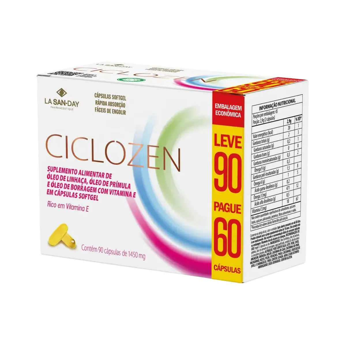 Ciclozen é um suplemento alimentar em cápsulas softgel, composto por óleo de linhaça, óleo de prímula, óleo de borragem e vitamina E. Sua formulação combina ácidos graxos essenciais e antioxidantes, sendo uma opção prática para complementar a alimentação diária.