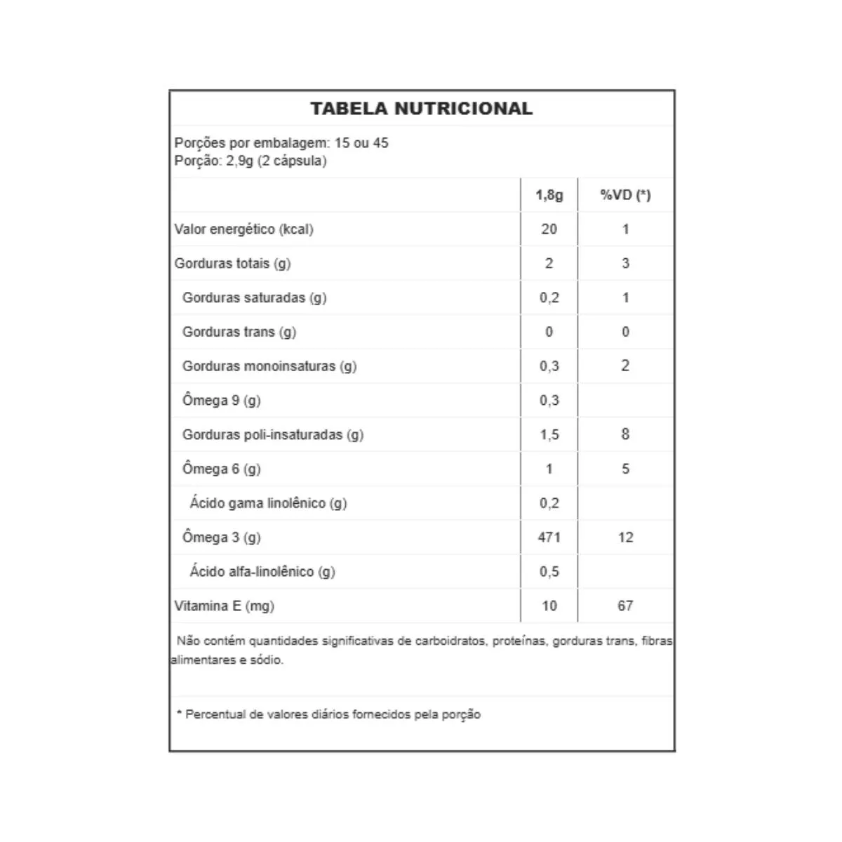 Óleo de linhaça, óleo de prímula, óleo de borragem e Vitamina E (acetato DL-alfa-tocoferol). Composição da cápsula: gelatina, umectante glicerina e água purificada. Recomendações de uso: