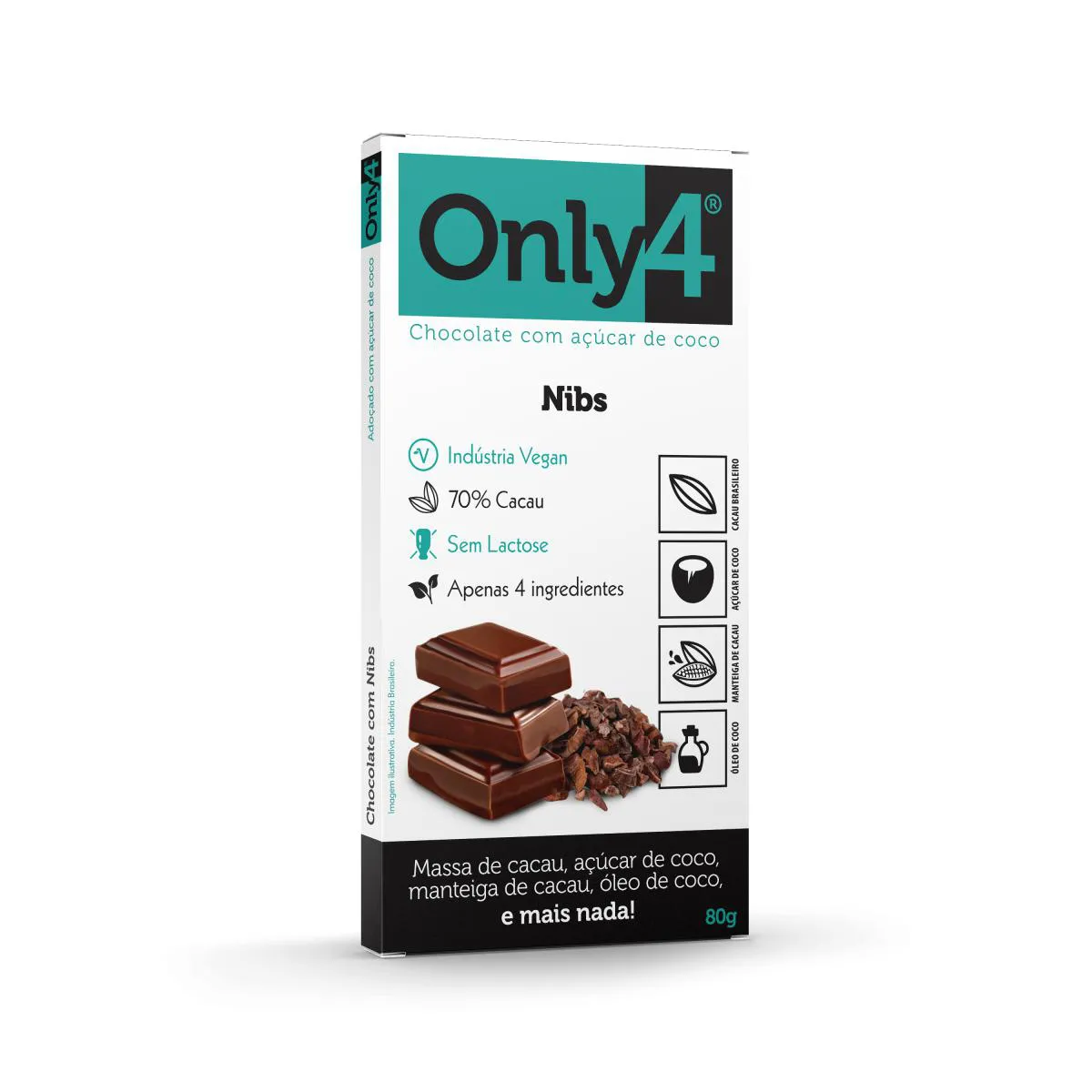 Chocolate 70% Cacau com Nibs Sem Lactose Vegano Only4 tem em sua composição base apenas 4 ingredientes, é indicada para pessoas que amam chocolates mais leves. Sem adoçantes ou açúcar refinado e mais suave comparado a outras marcas com o mesmo teor.