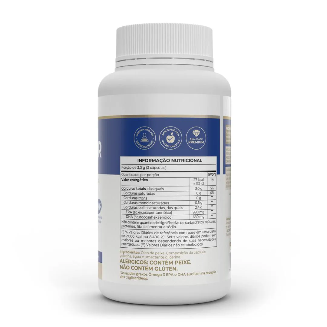 O Ômegafor Plus da Vitafor é um suplemento à base do óleo de peixe ultra concentrado que oferece 990mg EPA e 660mg DHA por porção recomendada O quão saudável está seu cérebro e coração neste momento? O nosso hábito alimentar mudou muito ao longo de centenas e milhares de anos. Passamos a comer mais açúcar, gorduras e alimentos pobres nutricionalmente. Por outro lado, alimentos com nutrientes necessários ao corpo humano, muitas vezes, ficam fora de nossa rotina. O resultado dessa alimentação é visto nos exames médicos colesterol e triglicérides altos são apenas dois exemplos de problemas decorrentes da má nutrição. Problemas deste tipo podem afetar o bom funcionamento do coração. O ômega 3 tem em sua composição os ácidos graxos EPA e DHA. O EPA é um ácido graxo essencial geralmente conhecido por sua ação no sistema cardiovascular. Enquanto o DHA é um ácido graxo essencial geralmente conhecido por sua ação no sistema cognitivo. Os ácidos graxos ômega 3 chegam a nosso corpo através da dieta, principalmente a base de peixes e frutos do mar. Uma forma de solucionar a ausência ou baixo consumo na dieta destes alimentos, ou reforçar a ingestão em momentos como a gestação é através da suplementação. Nosso Omegafor Plus se apresenta na forma TG (triglicerídeos), para facilitar a absorção do corpo. Omegafor Plus é um produto Premium que atende aos mais altos graus de exigência do mundo em pureza, potência e frescor. Isso deve-se presença da certificação IFOS em toda a linha de ômegas Vitafor. Ômega 3 EPA DHA ou Ômegafor Plus Uma porção do Ômega 3 EPA DHA oferece 540mg de EPA e 360mg de DHA. Na formulação do Ômegafor Plus temos alta concentração dos ácidos graxos ômega 3 990mg EPA e 660mg de DHA por porção. Cada ser humano é único, por isso oferecemos diversas concentrações na família de ômegas, dessa forma atendemos as necessidades individuais, e as dosagens recomendadas para cada um por seu profissional de saúde. Benefícios do consumo: