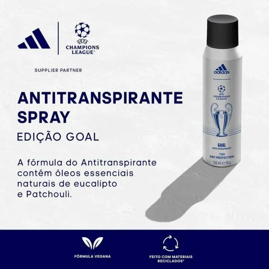 O kit contém: 1 Perfume A d i d a s U e f a G o a l Eau de Toilette - 100ml 1 Desodorante - 150ml A d i d a s U e f a G o a l Kit: perfume masculino + Desodorante Sobre a fragrância: O Perfume A d i d a s U E F A C h a m p i o n s League Edição G o a l é um Eau de Toilette aromático verde, que possui uma fragrância refrescante e poderosa com um toque amadeirado e fresco. Com longa duração, sua fórmula é vegana e feita com materiais reciclados. Conta com uma tecnologia patenteada que promove uma sensação de frescor prolongada durante o dia. Nas notas de topo temos abacaxi, laranja e cardamomo. Já nas notas de coração sálvia, lavanda e gerânio. Por fim, nas notas de fundo temos vetiver, cedro e patchouli. A d i d a s U E F A G o a l, celebra o poder, a singularidade e o amor pelo jogo.