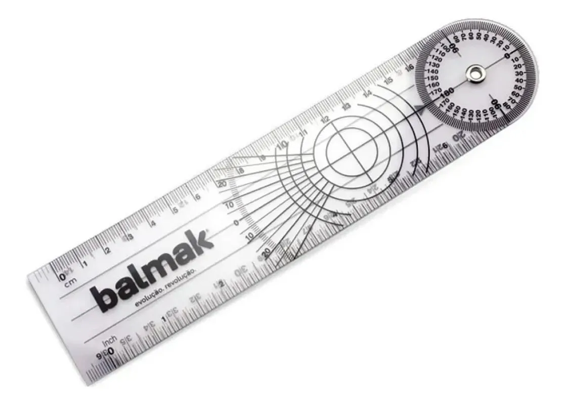 - Goniômetro transparente que permite medições precisas de amplitude articular com rotação de 360 graus.