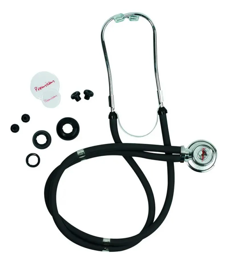 - Estetoscópio com tubo duplo para ausculta precisa.