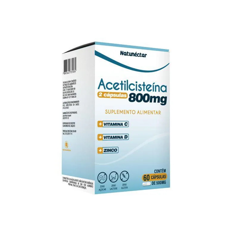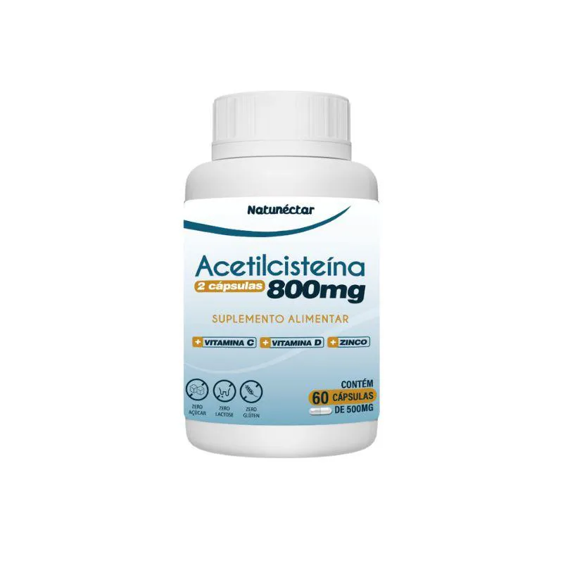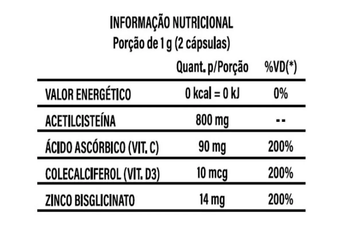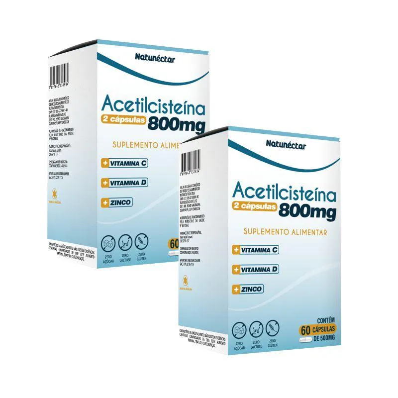 02 Caixas de Acetilcisteína 500mg de 30 cápsulas Modo de usar: tomar de 1 cápsula 2 vezes ao dia. Composição: Acetilcisteína, Ácido Ascórbico, Colecalciferol e Zinco. Precauções: Este produto não deve ser consumido por gestantes, lactantes e crianças, exceto sob supervisão médica. Indicado para grupo populacional maior ou igual a 19 anos. Este produto não é um medicamento. Dispensado de registro conforme RDC 240/2018. *IMAGENS ILUSTRATIVAS