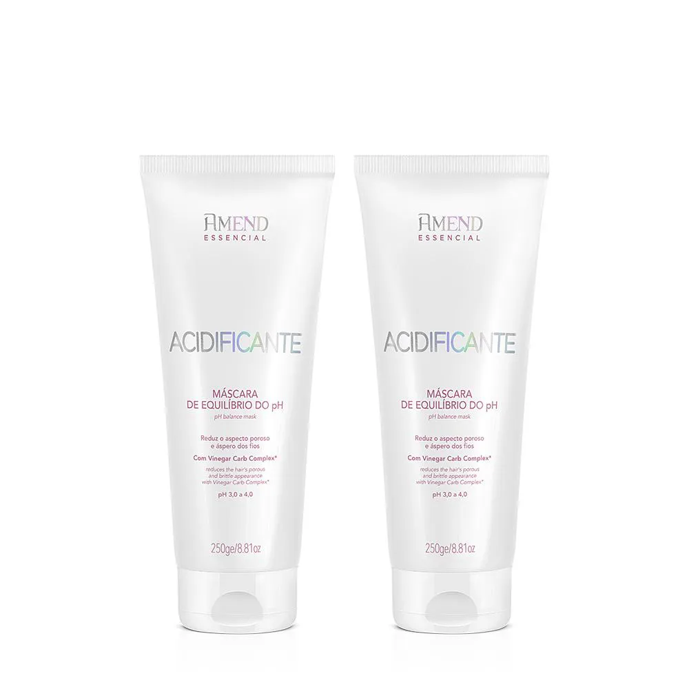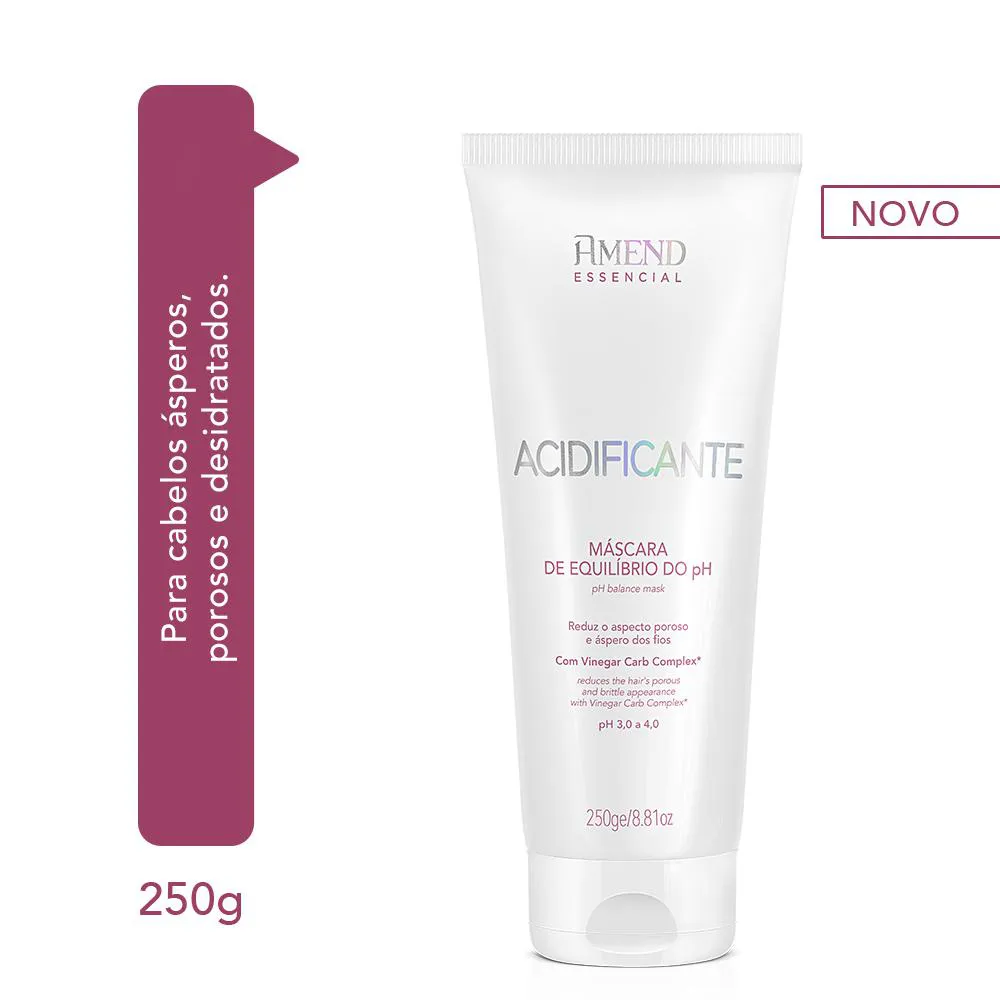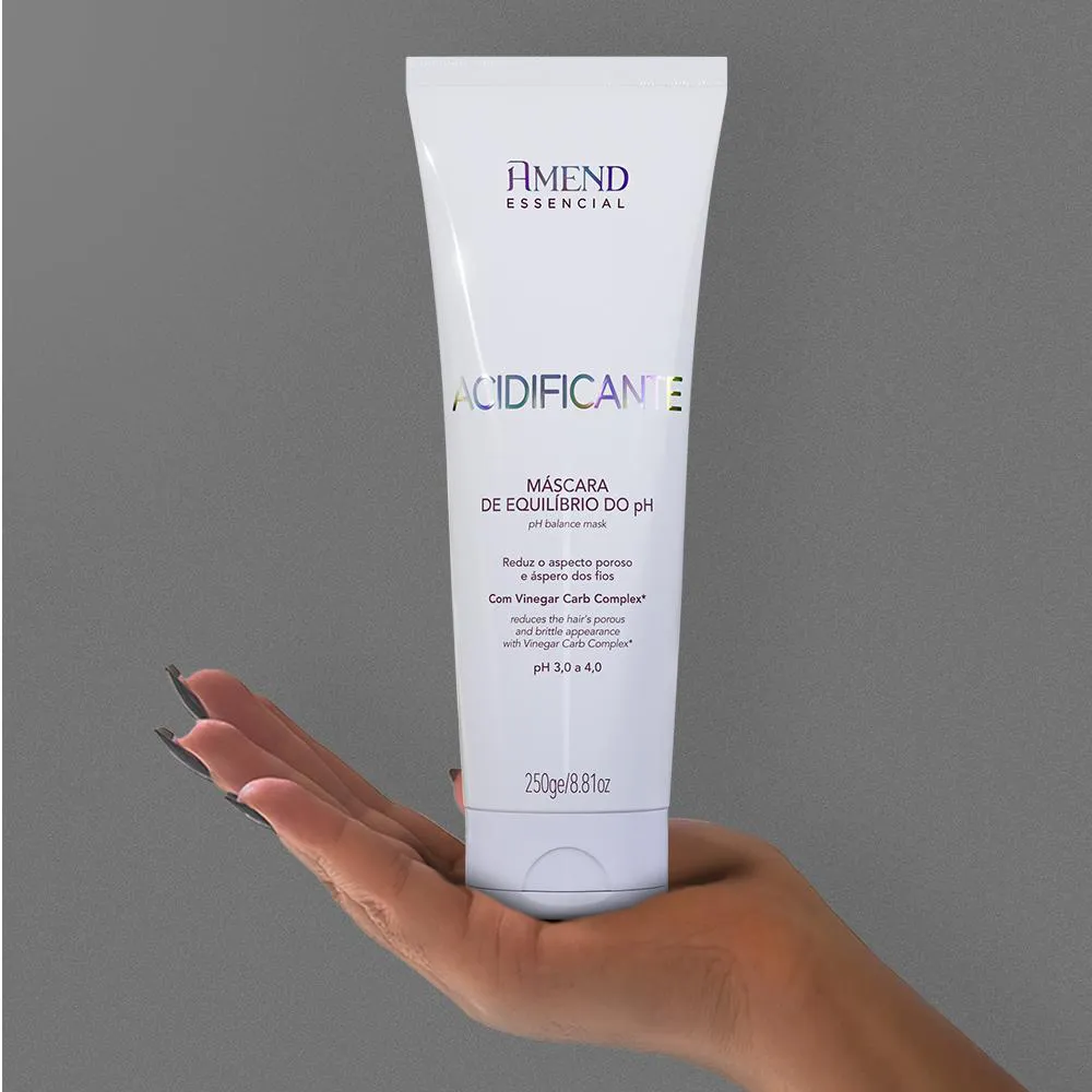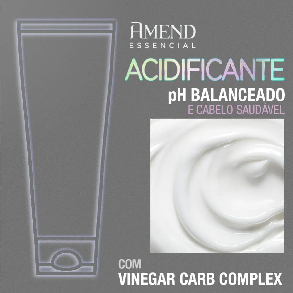 Acidificante Máscara de Equilíbrio do pH Amend Essencial Desenvolvido especialmente para o cuidado dos cabelos ásperos,porosos e desidratados que foram expostos a fontes de calor, como secador e chapinha, ou que passaram por processos de transformação, como descoloração, coloração ou alisamentos. Possui em sua formulação o Vinegar Carb Complex*, uma combinação de Vinagre de Frutas Ácidas (maçã, limão e tamarindo) que reequilibra o pH da fibra capilar, evitando a abertura da cutícula e permitindo que o cabelo volte a absorver e reter a água e mais dois ativos que combinam aminoácidos e carboidratos que juntos reduzem o frizz e o aspecto poroso do fio, selam as cutículas, reequilibram o pH, hidratam, diminuem o volume e auxiliam na redução da quebra,deixando os cabelos saudáveis, rejuvenescidos, macios e naturalmente brilhantes.