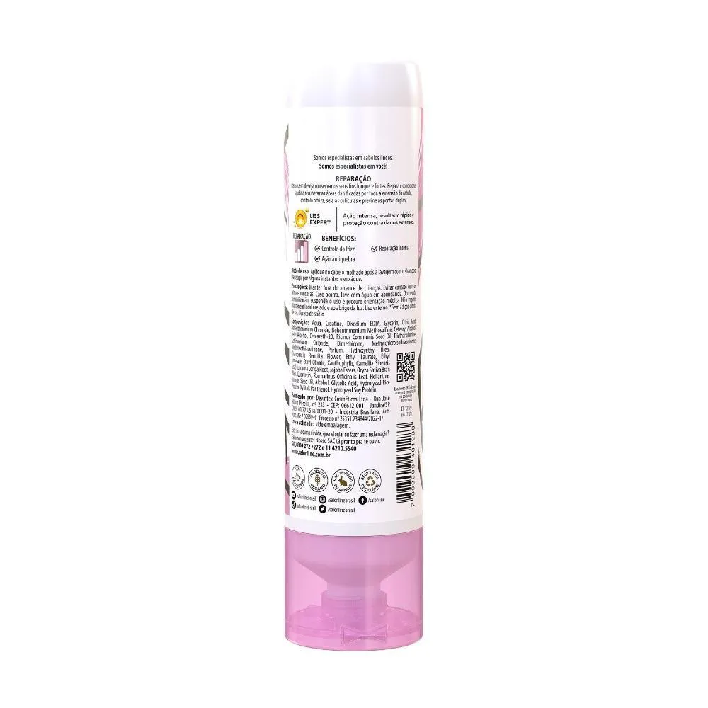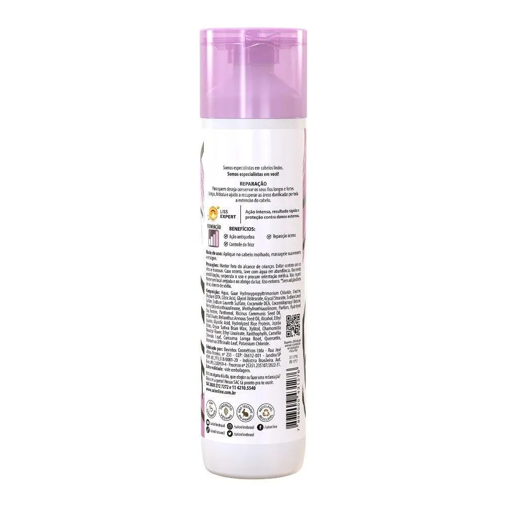 Condicionador Meu Liso Muito + Longo: após lavar o cabelo com o Shampoo, aplique o Condicionador Meu Liso Muito + Longo no comprimento e nas pontas dos fios. Enxágue.