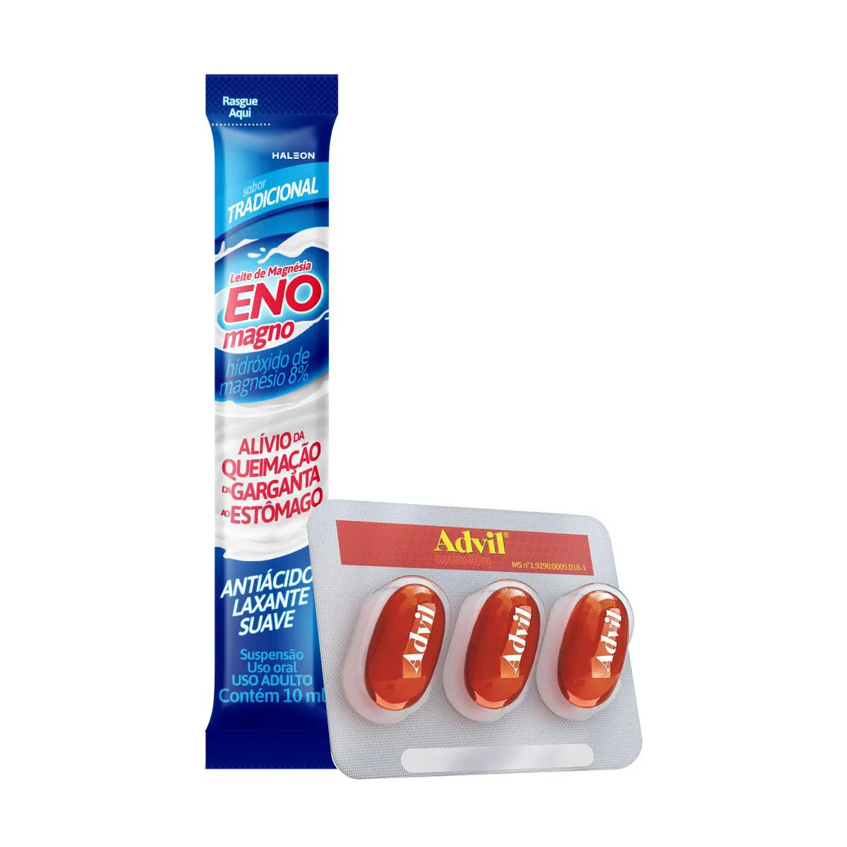 O Kit Advil Ibuprofeno + Leite de Magnésia EnoMagno Tradicional Suspensão Oral é um conjunto de produtos que combinam um analgésico e anti-inflamatório (Advil) com um medicamento antiácido e laxante suave (Leite de Magnésia EnoMagno). O Advil contém Ibuprofeno 400mg e promove alívio temporário de dores de cabeça, dores nas costas, dores musculares, cólica menstrual, gripes e resfriados comuns, dor de artrite e dor de dente. O Leite de Magnésia EnoMagno, com sabor de tradicional, possui ação antiácida e laxativa suave.