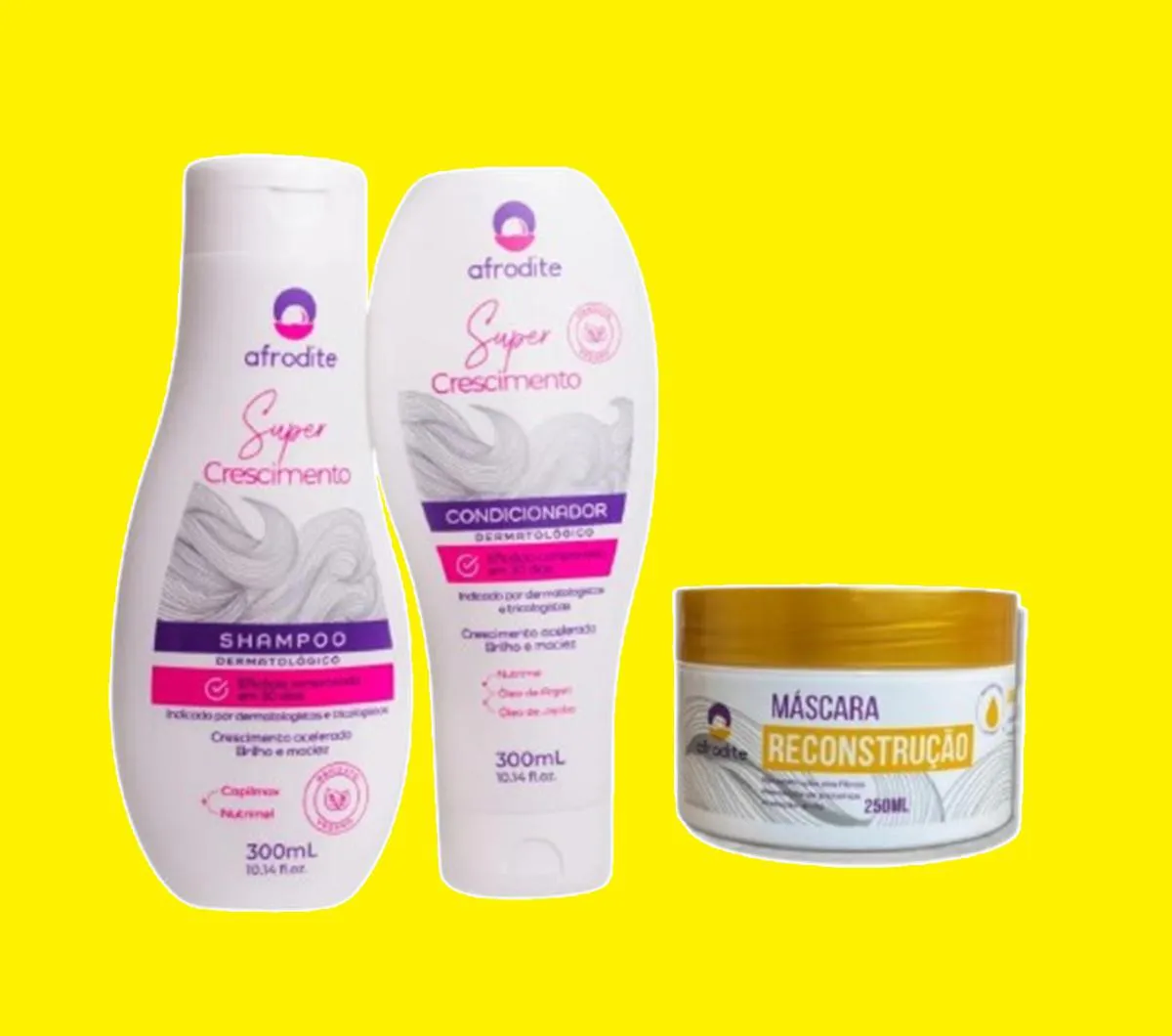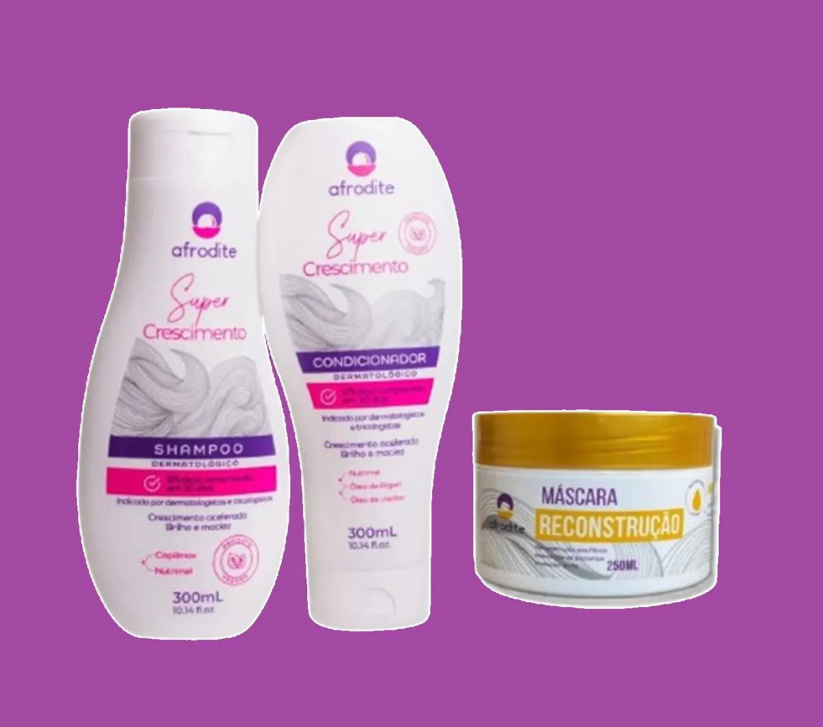 Este kit contém 2 shampoo afrodite crescimento 300ml, 2 condicionador afrodite crescimento 300ml, 1 máscara afrodite reconstrução de 250ml.