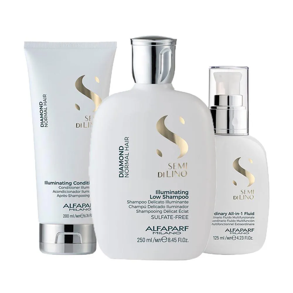 Imagem Meramente Ilustrativa. * ITENS INCLUSOS: 1 Alfaparf Semi Di Lino Diamond Illuminating Shampoo 250 ml1 Alfaparf Semi Di Lino Diamond Illuminating Condicionador 200 ml1 Alfaparf Semi Di Lino Diamond Extraordinary All in Finalizador 125 ml