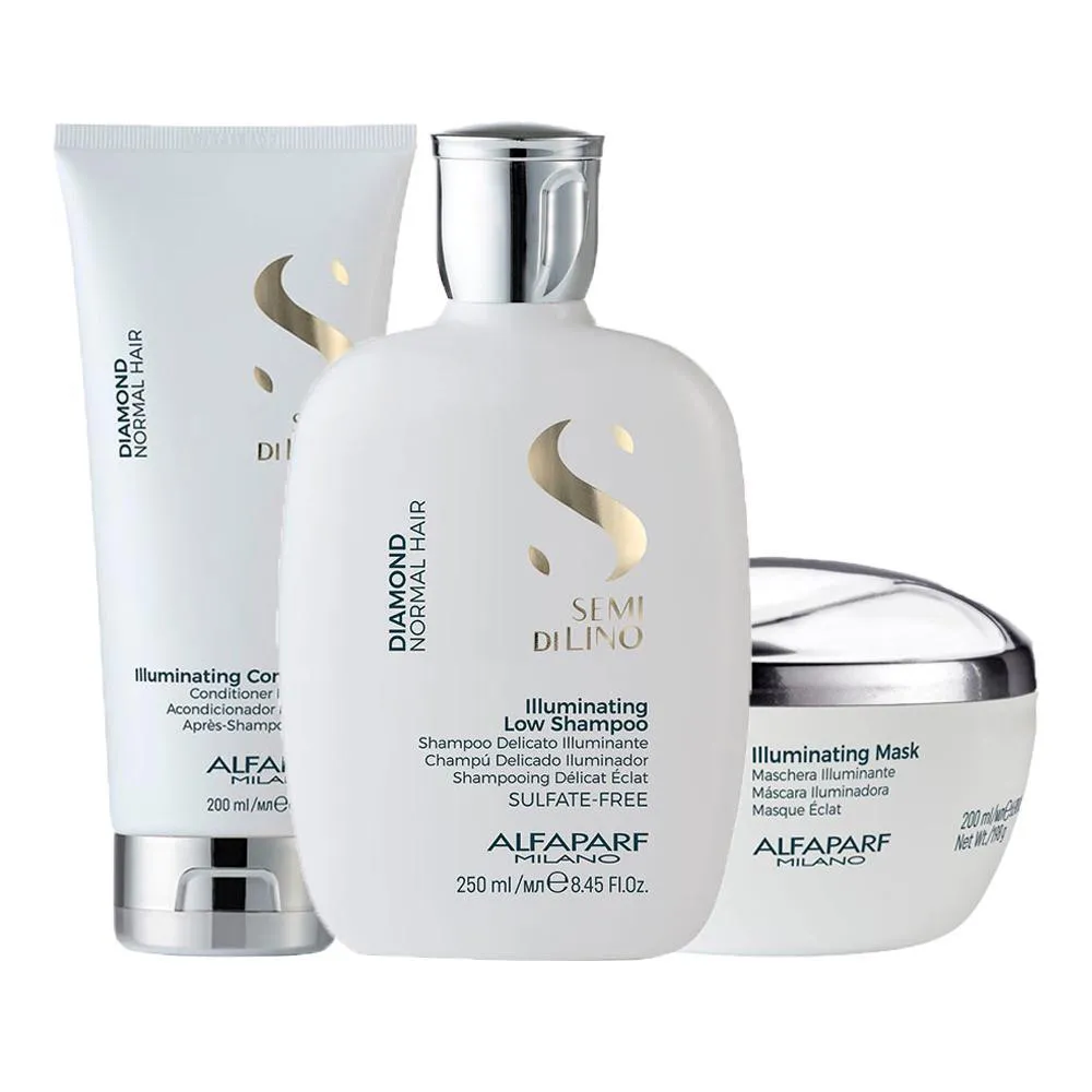 A linha Semi Di Lino Diamond indicada para todos os tipo de cabelos, intensifica o brilho enquanto proporciona maleabilidade aos fios.Seus ativos proporcionam 24 horas de poder iluminador das raízes até as pontas, contém proteção UV, antioxidantes que ajudam a prolongar a cor e o Complexo Multivitamínico que garante a recarga de energia para a fibra capilar.Com Kit Alfaparf Semi Di Lino Diamond, seus cabelos sedosos e com a luminosidade de um diamante! * RESULTADO: