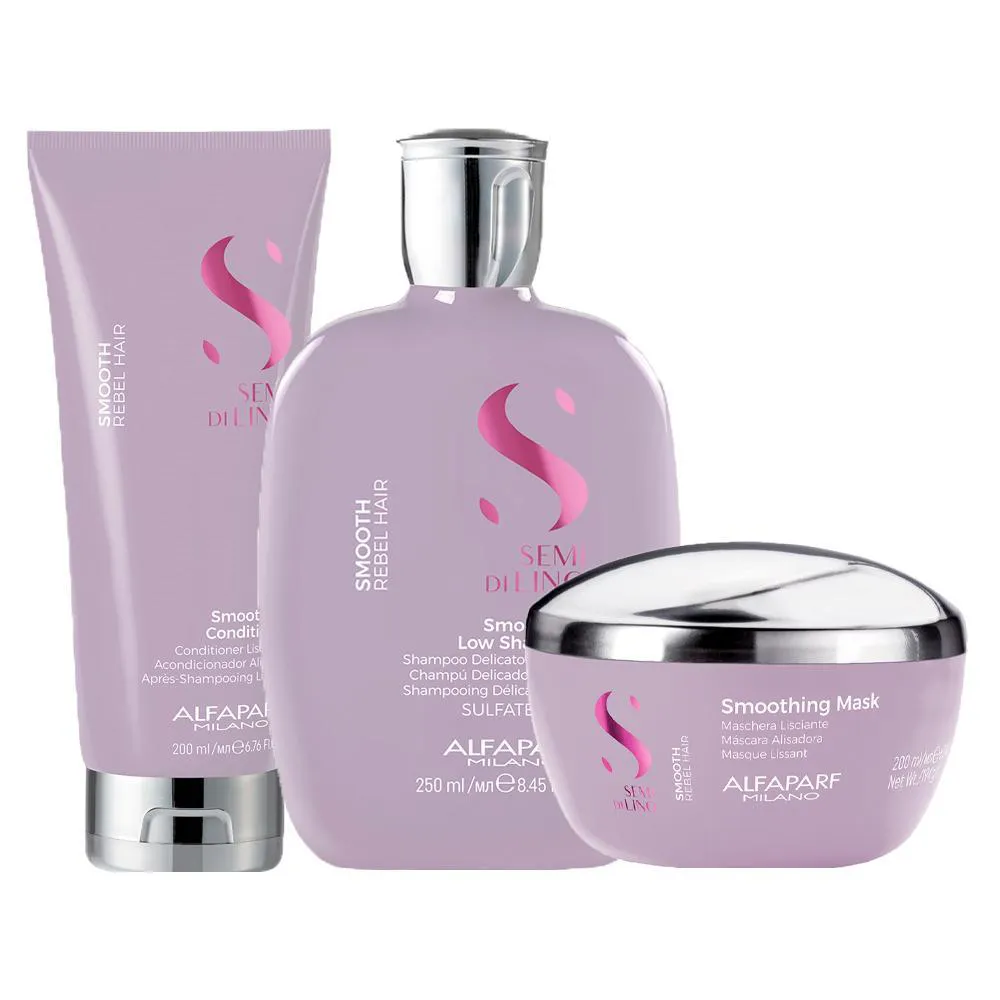 A linha Semi di Lino Smooth indicada para o tratamento de controle dos cabelos indisciplinados e difíceis de cuidar. O Kit Alfaparf Semi Di Lino Smooth Smoothing proporciona alinhamento dos fios com efeitos incríveis e imediatos. Além disso, controla o frizz causado pela umidade e pelos agentes atmosféricos.