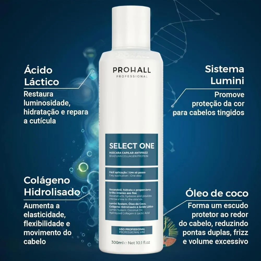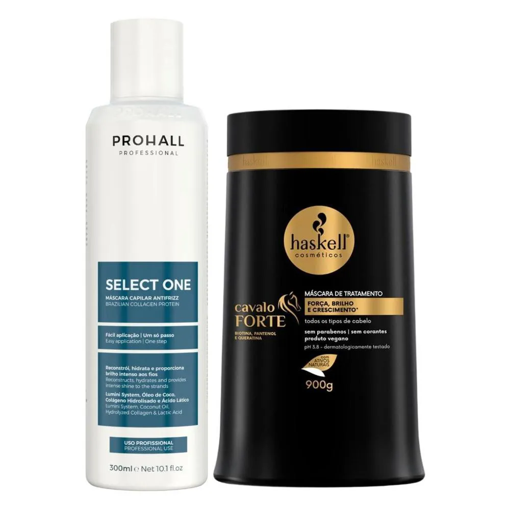 Dois itens estratégicos para quem busca fios mais disciplinados, resistentes e com aparência saudável.Ideal para cabelos indisciplinados, volumosos, com frizz, enfraquecidos ou com crescimento fragilizado, o kit atua no alinhamento da fibra capilar e no fortalecimento profundo dos fios, promovendo controle, brilho e vitalidade.O tratamento térmico Select One promove alinhamento temporário da fibra, redução de volume e controle de frizz, deixando os cabelos mais lisos, macios e com aspecto uniforme, sem alterar permanentemente a estrutura dos fios e a máscara Cavalo Forte realiza nutrição e fortalecimento intensivos, auxiliando no crescimento saudável, na redução da quebra e no aumento da resistência, devolvendo brilho, maciez e densidade ao comprimento.Indicado para rotinas de disciplina e fortalecimento, o kit proporciona cabelos mais alinhados, fortes, com toque sedoso, menos frizz e aparência visivelmente saudável desde a raiz até as pontas.