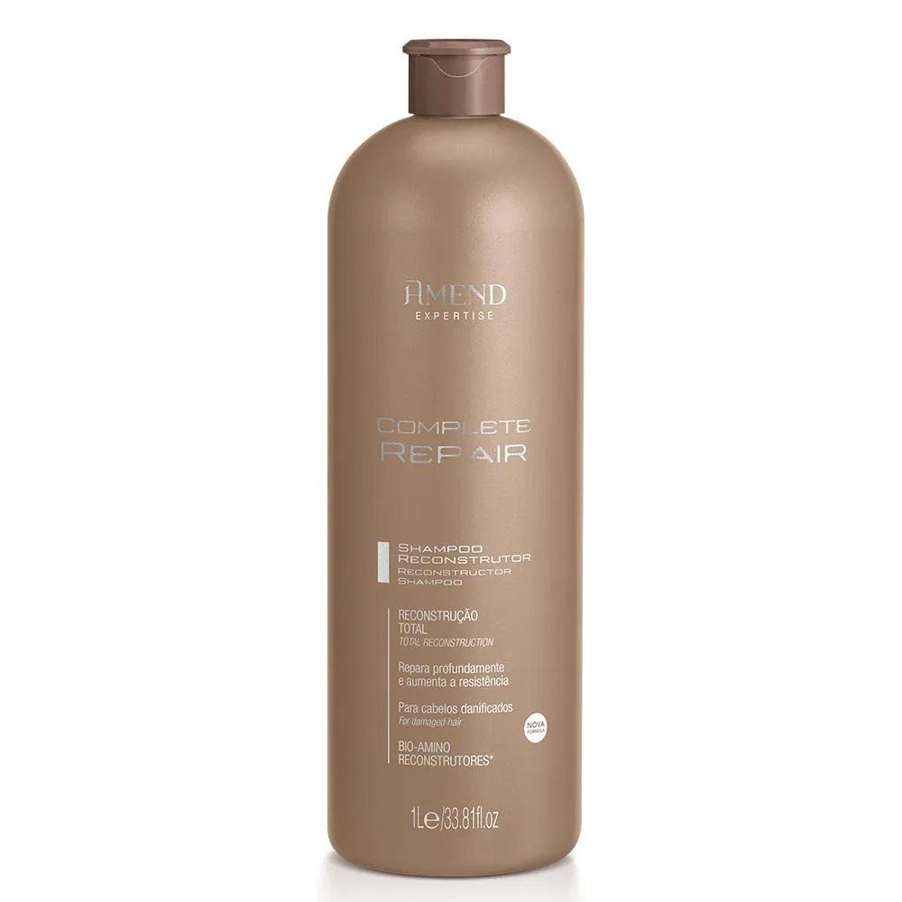 shampoo Reconstrutor Amend Expertise Complete Repair Limpa os fios suavemente. Com Bio-Amino Reconstrutores* que agem na reparação profunda e no resgate da vitalidade, força, elasticidade e brilho. Cabelos sedosos e protegidos de danos futuros. Fórmula vegana.