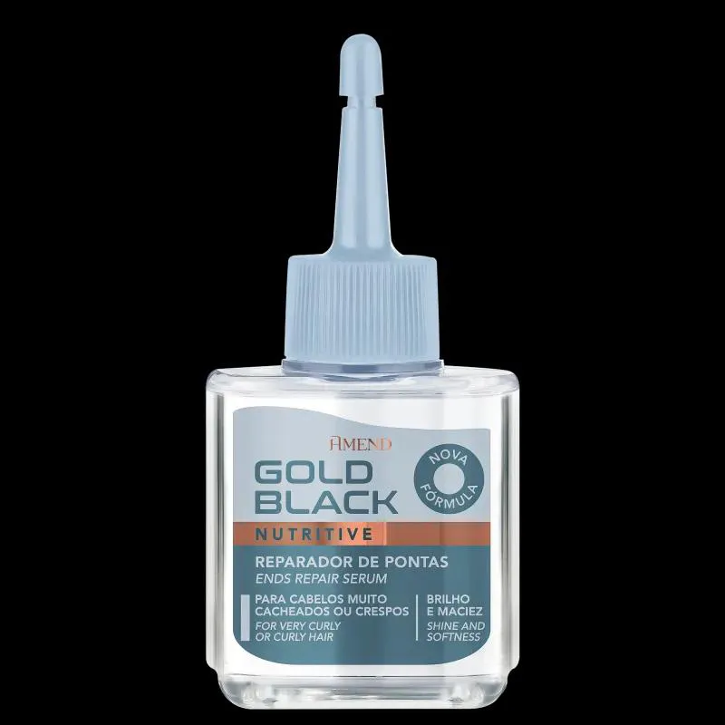 O Amend Gold Black Reparador de Pontas é um tratamento intensivo para cabelos cacheados, ondulados e crespos, proporcionando brilho, maciez e reparação das pontas duplas e ressecadas.