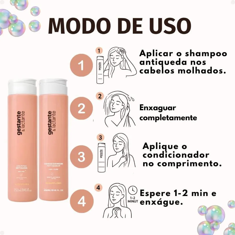 Este kit é perfeito para o uso diário de gestantes e lactantes que desejam prevenir e tratar a queda capilar, mantendo os cabelos saudáveis e bem cuidados durante um período tão especial da vida.Modo de Uso/Aplicação