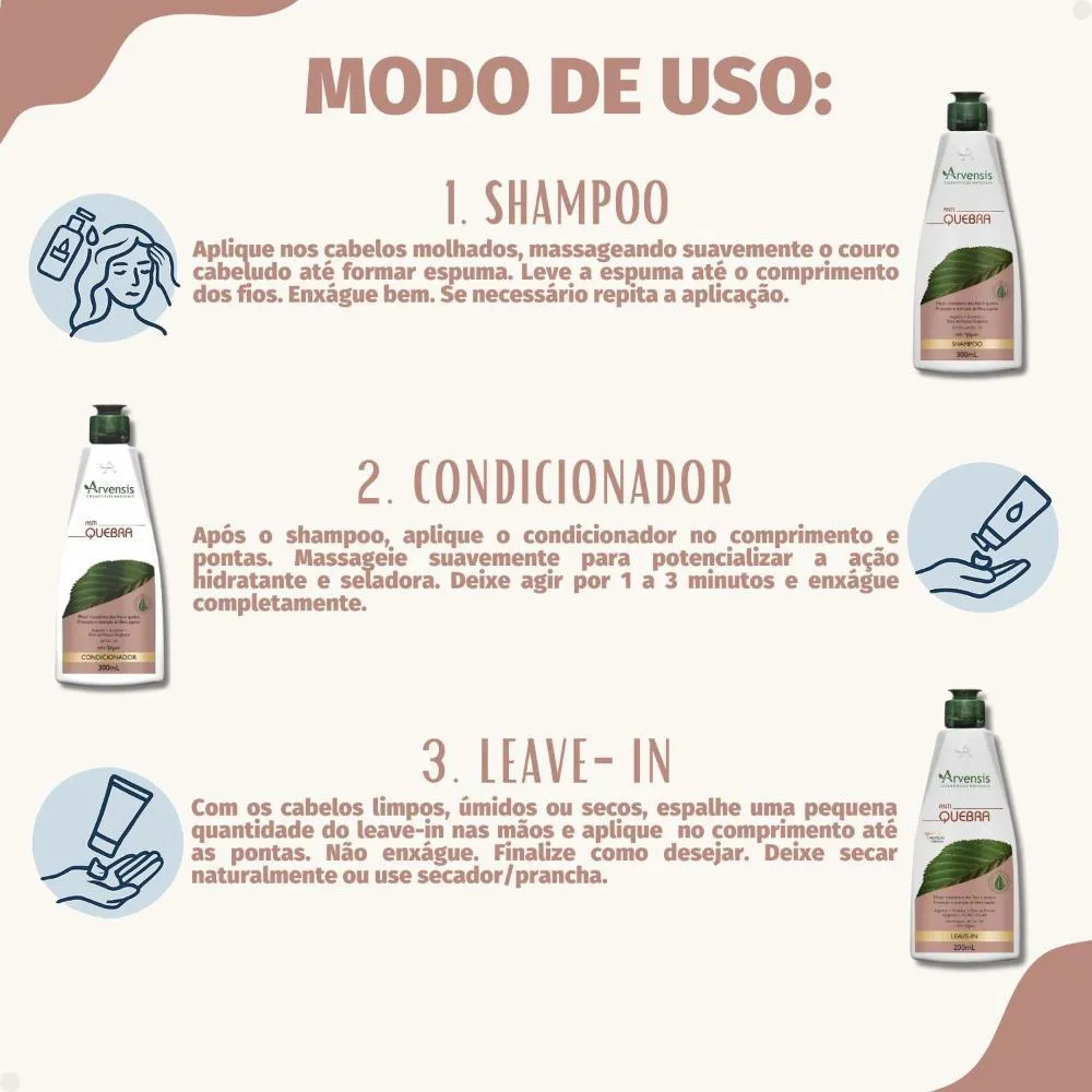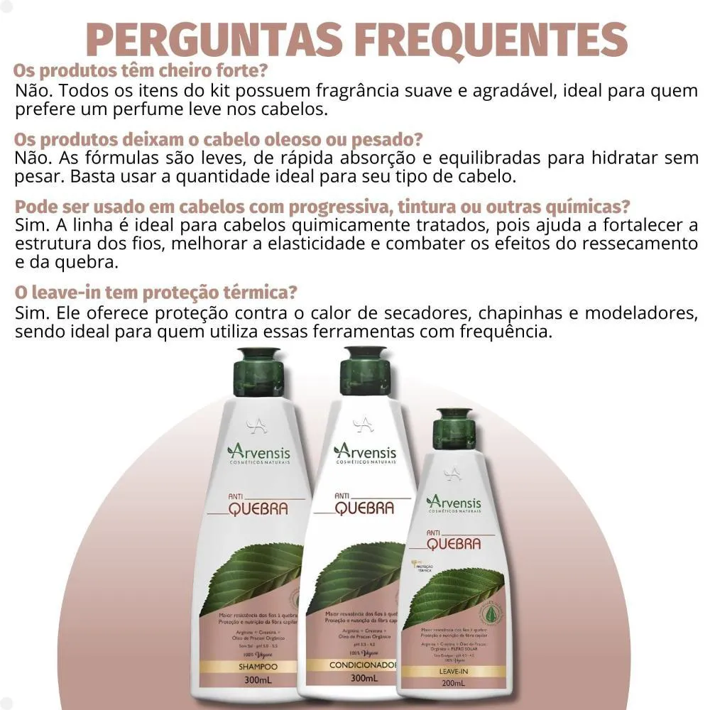 Contém 01 shampoo Arvensis Anti Quebra 300ml 01 condicionador Arvensis Anti Quebra 300ml 01 Leave-in Arvensis Anti Quebra 200ml . O Kit Arvensis Anti Quebra foi cuidadosamente desenvolvido para recuperar a saúde de cabelos enfraquecidos, quebradiços ou danificados por agressões químicas, mecânicas ou ambientais. Sua fórmula inteligente e multifuncional combina ingredientes de origem vegetal, proteínas fortalecedoras e agentes hidratantes, que atuam em todas as etapas do cuidado capilar: limpeza, hidratação e proteção. Do couro cabeludo às pontas, o kit oferece um tratamento completo e progressivo. O Shampoo limpa suavemente sem agredir, iniciando o processo de fortalecimento já no momento da lavagem. O Condicionador hidrata na medida certa, sela as cutículas e melhora o desembaraço, deixando os fios macios, alinhados e com brilho. Finalizando, o Leave-In atua como escudo protetor diário com ação antifrizz, proteção térmica e controle de pontas duplas, além de manter o tratamento ativo ao longo do dia. É a escolha ideal para quem busca cabelos mais resistentes, sedosos e visivelmente saudáveis, mesmo após exposição a colorações, descolorações, alisamentos ou uso frequente de secador e chapinha. . Modo de Uso Shampoo: Aplique o shampoo nos cabelos molhados, massageando o couro cabeludo e o comprimento dos fios. Enxágue bem. Reaplique, se necessário. Condicionador: Após o uso do shampoo, aplique o condicionador do comprimento às pontas, massageando suavemente. Deixe agir por 1 minuto, em seguida, enxágue bem. Leave-in: Com os cabelos limpos, secos ou úmidos, aplique uma quantidade do leave-in na palma das mãos e espalhe do comprimento para as pontas. . Perguntas Frequentes Os produtos ajudam realmente a reduzir a quebra dos fios? Sim! A linha foi formulada com ativos fortalecedores e nutritivos que atuam na fibra capilar, reconstruindo e reforçando os fios, o que reduz a quebra progressivamente com o uso contínuo. O leave-in tem proteção térmica? Sim. Ele oferece proteção contra o calor de secadores, chapinhas e modeladores, sendo ideal para quem utiliza essas ferramentas com frequência. Os produtos deixam o cabelo oleoso ou pesado? Não. As fórmulas são leves, de rápida absorção e equilibradas para hidratar sem pesar. Basta usar a quantidade ideal para seu tipo de cabelo. Pode ser usado em cabelos com progressiva, tintura ou outras químicas? Sim. A linha é ideal para cabelos quimicamente tratados, pois ajuda a fortalecer a estrutura dos fios, melhorar a elasticidade e combater os efeitos do ressecamento e da quebra. Os produtos têm cheiro forte? Não. Todos os itens do kit possuem fragrância suave e agradável, ideal para quem prefere um perfume leve nos cabelos. . Código de Registro Sanitário(ANVISA) Shampoo: 25351.030794/2013-18 Condicionador: 25351.030833/2013-79 Leave-in: 25351.037133/2013-13