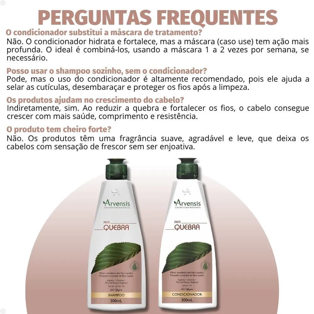 Contém: 01 shampoo Arvensis Anti Quebra 300ml 01 condicionador Arvensis Anti Quebra 300ml . O Kit Arvensis Anti Quebra foi desenvolvido especialmente para cabelos enfraquecidos, danificados ou com tendência à quebra. Com fórmulas enriquecidas com ativos vegetais fortalecedores, proteínas e agentes hidratantes, o shampoo e o condicionador atuam juntos para restaurar a estrutura capilar, devolver resistência aos fios e prevenir a quebra causada por agressões químicas, térmicas ou ambientais. O Shampoo Anti Quebra limpa suavemente, removendo impurezas sem agredir o couro cabeludo, enquanto inicia o processo de reconstrução capilar. Já o Condicionador Anti Quebra desembaraça, nutre e sela as cutículas, deixando os cabelos mais macios, alinhados e protegidos contra novas quebras. . Modo de Uso Shampoo: Aplique o shampoo nos cabelos molhados, massageie o couro cabeludo e comprimento dos fios suavemente até formar espuma. Enxágue bem. Reaplique, se necessário. Condicionador: Após o uso do shampoo, aplique o condicionador do comprimento às pontas, massageando suavemente. Deixe agir por 1 minuto, em seguida enxágue com água em abundância. . Perguntas Frequentes O condicionador substitui a máscara de tratamento? Não. O condicionador hidrata e fortalece, mas a máscara (caso use) tem ação mais profunda. O ideal é combiná-los, usando a máscara 1 a 2 vezes por semana, se necessário. Posso usar o shampoo sozinho, sem o condicionador? Pode, mas o uso do condicionador é altamente recomendado, pois ele ajuda a selar as cutículas, desembaraçar e proteger os fios após a limpeza. Os produtos ajudam no crescimento do cabelo? Indiretamente, sim. Ao reduzir a quebra e fortalecer os fios, o cabelo consegue crescer com mais saúde, comprimento e resistência. O produto tem cheiro forte? Não. Os produtos têm uma fragrância suave, agradável e leve, que deixa os cabelos com sensação de frescor sem ser enjoativa. É necessário usar com o Leave-In da linha? Não é obrigatório, mas o uso do Leave-In Arvensis Anti Quebra complementa o tratamento, oferecendo proteção térmica, controle de frizz e manutenção da hidratação ao longo do dia. . Código de Registro Sanitário(ANVISA) Shampoo: 25351.030794/2013-18 Condicionador: 25351.030833/2013-79
