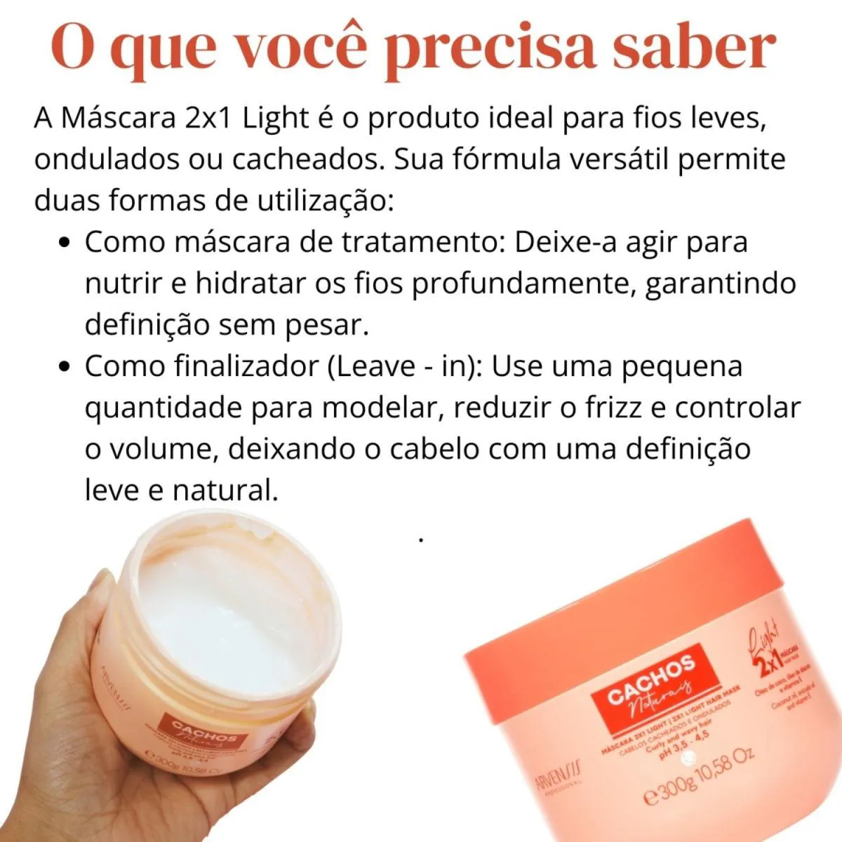 Máscara 2x1 Light 300g Essa máscara multifuncional pode ser usada como tratamento (com enxágue) ou como leave-in (sem enxágue). Ideal para fios finos que precisam de hidratação leve e definição sem rigidez.