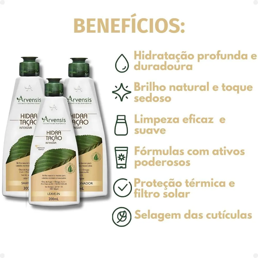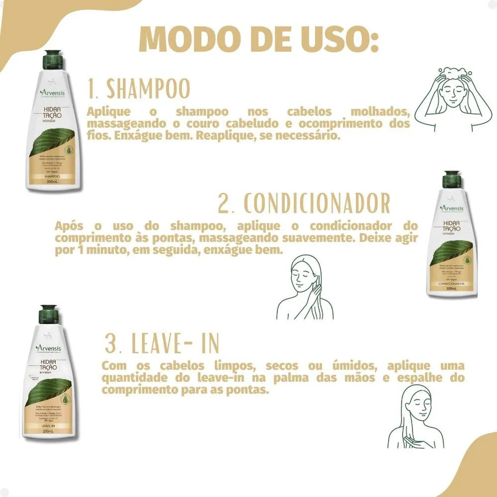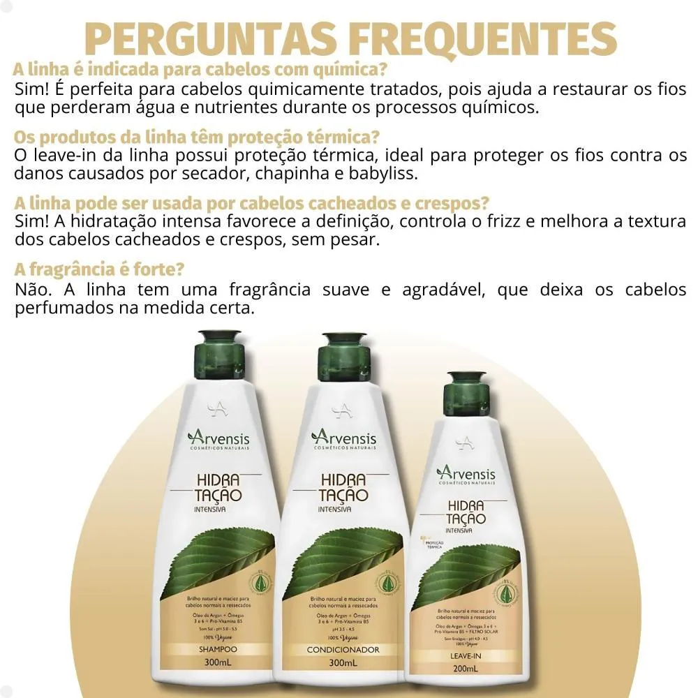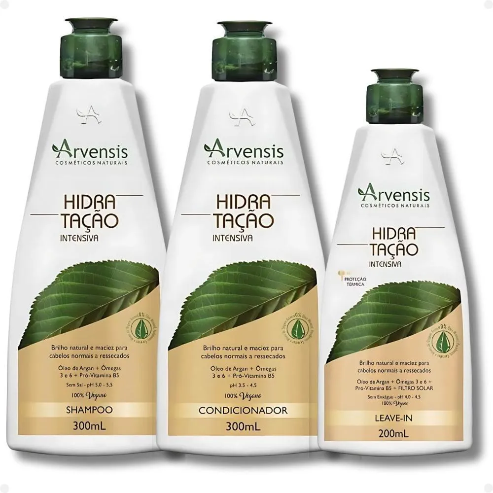 Contém 01 shampoo Arvensis Hidratação Intensiva 300ml 01 condicionador Arvensis Hidratação Intensiva 300ml 01 Leave-in Arvensis Hidratação Intensiva 200ml . A linha Arvensis Hidratação Intensiva foi desenvolvida especialmente para cabelos que sofrem com o ressecamento, a opacidade e a rigidez. Com fórmulas equilibradas e enriquecidas com ativos emolientes e nutritivos, ela promove uma reposição intensa de umidade nos fios, devolvendo a maciez, o brilho e a elasticidade natural dos cabelos. Indicada para todos os tipos de cabelo que precisam de hidratação — especialmente os secos, danificados, ásperos ou quimicamente tratados — a linha age desde a limpeza até a finalização, garantindo resultados visíveis desde a primeira aplicação. Composta por shampoo, condicionador, máscara e leave-in, a linha proporciona tratamento completo, cuidando da fibra capilar sem pesar e deixando os cabelos leves, sedosos e mais fáceis de pentear. . Modo de Uso Shampoo: Aplique o shampoo nos cabelos molhados, massageando o couro cabeludo e ocomprimento dos fios. Enxágue bem. Reaplique, se necessário. Condicionador: Após o uso do shampoo, aplique o condicionador do comprimento às pontas, massageando suavemente. Deixe agir por 1 minuto, em seguida, enxágue bem. Leave-in: Com os cabelos limpos, secos ou úmidos, aplique uma quantidade do leave-in na palma das mãos e espalhe do comprimento para as pontas. . Perguntas Frequentes Posso usar todos os produtos da linha diariamente? Sim! Shampoo, condicionador e leave-in foram formulados para uso diário. A máscara pode ser usada de 1 a 2 vezes por semana, conforme a necessidade do seu cabelo. A linha é indicada para cabelos com química? Sim! É perfeita para cabelos quimicamente tratados, pois ajuda a restaurar os fios que perderam água e nutrientes durante os processos químicos. Os produtos da linha têm proteção térmica? O leave-in da linha possui proteção térmica, ideal para proteger os fios contra os danos causados por secador, chapinha e babyliss. A linha pode ser usada por cabelos cacheados e crespos? Sim! A hidratação intensa favorece a definição, controla o frizz e melhora a textura dos cabelos cacheados e crespos, sem pesar. A fragrância é forte? Não. A linha tem uma fragrância suave e agradável, que deixa os cabelos perfumados na medida certa. . Código de Registro Sanitário(ANVISA) Shampoo: 25351.137424/2018-15 Condicionador: 25351.137427/2018-41 Leave-in: 25351.137426/2018-04