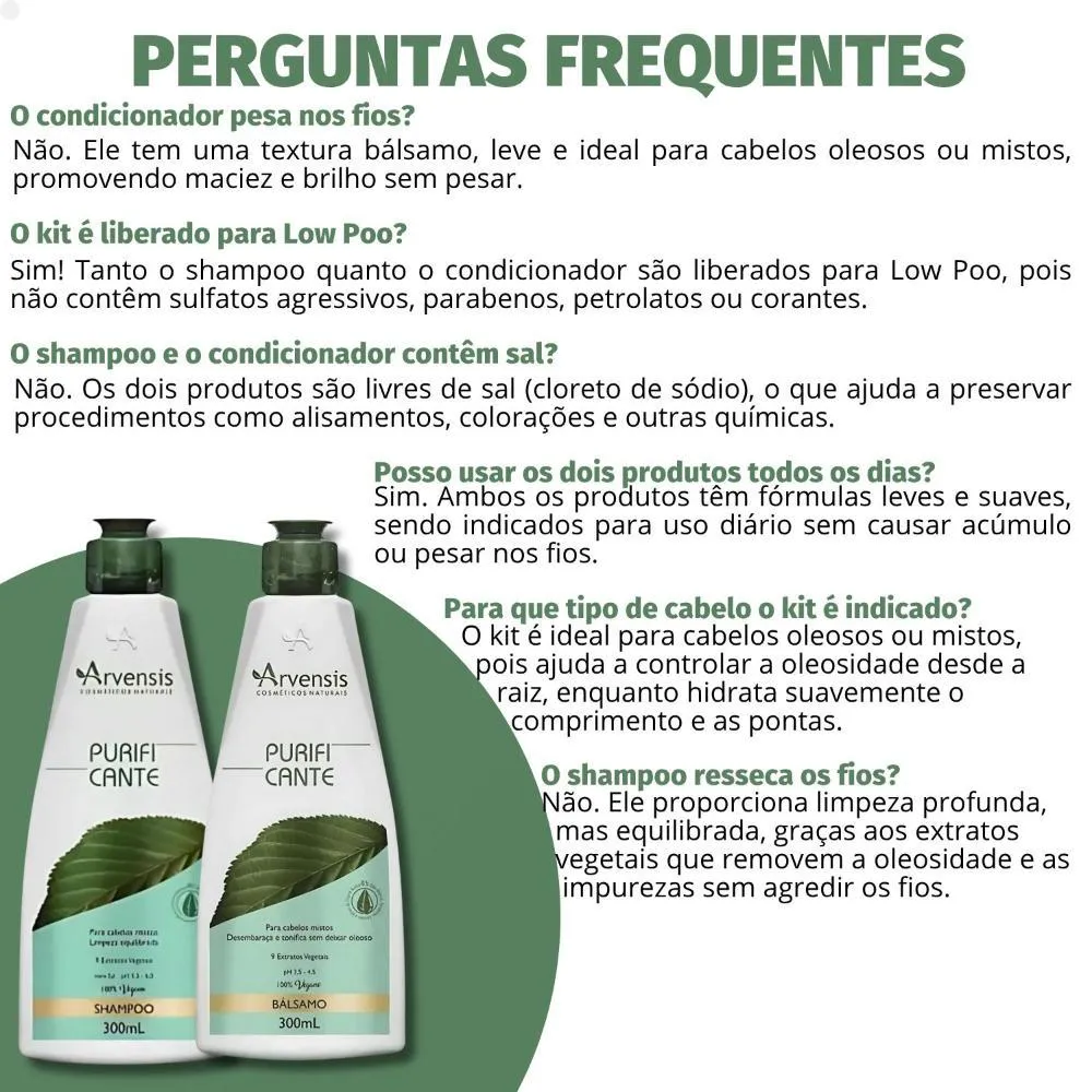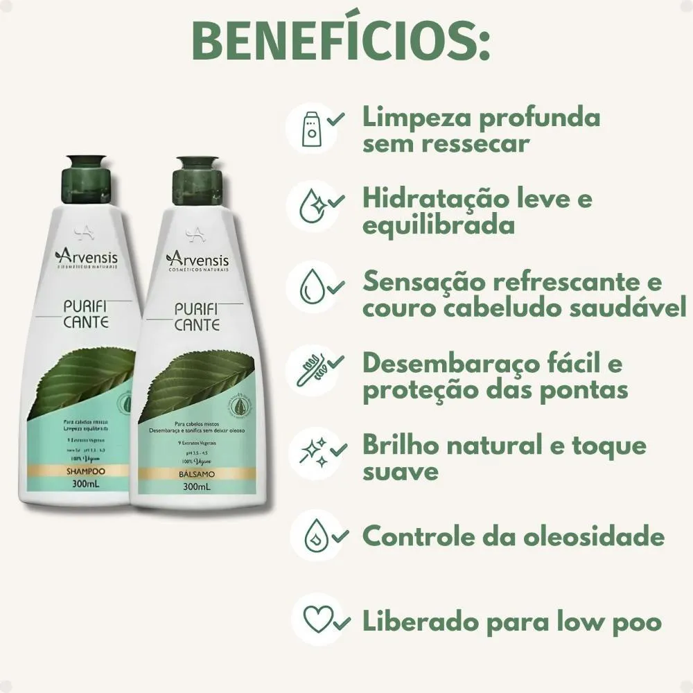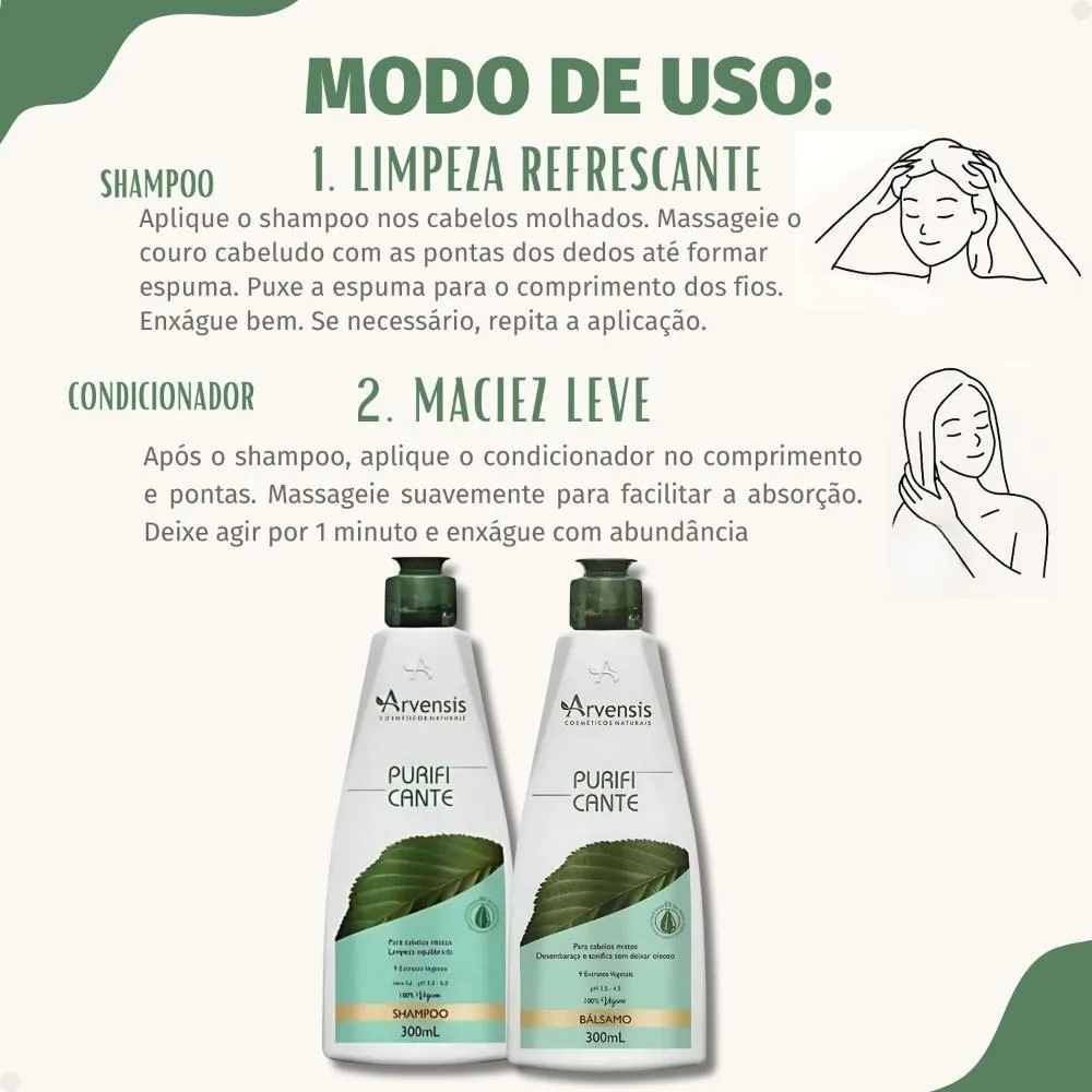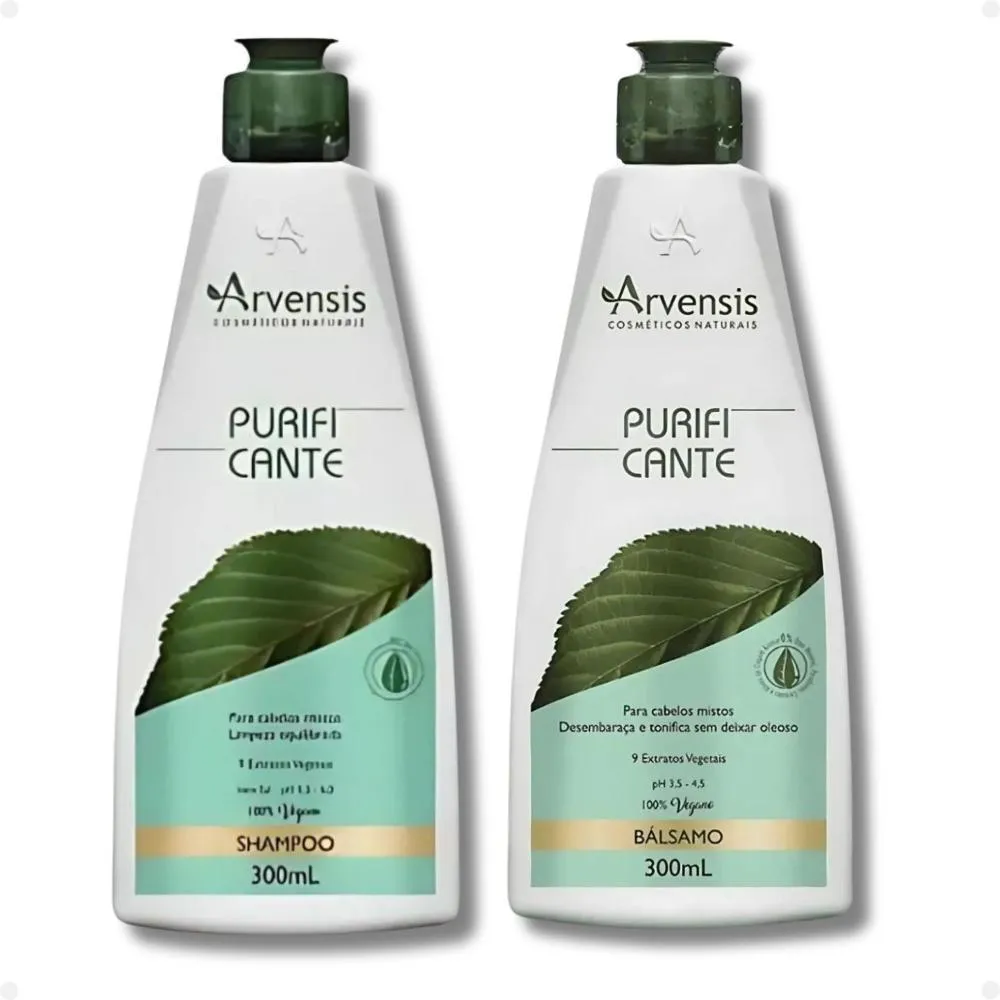 Contém: 01 shampoo Arvensis Purificante 300ml 01 condicionador Bálsamo Arvensis Purificante 300ml . O Kit Arvensis Purificante é a combinação perfeita para quem busca cabelos soltos, limpos e hidratados na medida certa. Formulado especialmente para cabelos oleosos ou mistos, o kit traz o Shampoo Purificante 300ml e o Condicionador Bálsamo Purificante 300ml, que atuam juntos para proporcionar uma limpeza profunda, controle da oleosidade e hidratação leve, sem pesar os fios. Com extratos botânicos purificantes, os produtos equilibram o couro cabeludo, removem impurezas e deixam os cabelos com brilho natural, toque suave e sensação refrescante por mais tempo. Além disso, o kit é livre de sal, parabenos, petrolatos e corantes, sendo ideal para quem busca uma rotina de cuidados capilares mais natural, suave e eficaz. . Modo de Uso Shampoo: Aplique o shampoo nos cabelos molhados, massageie o couro cabeludo e comprimento dos fios suavemente até formar espuma. Enxágue bem. Reaplique, se necessário. Condicionador: Após o uso do shampoo, aplique o condicionador do comprimento às pontas, massageando suavemente. Deixe agir por 1 minuto, em seguida enxágue com água em abundância. . Perguntas Frequentes Para que tipo de cabelo o kit é indicado? O kit é ideal para cabelos oleosos ou mistos, pois ajuda a controlar a oleosidade desde a raiz, enquanto hidrata suavemente o comprimento e as pontas. Posso usar os dois produtos todos os dias? Sim. Ambos os produtos têm fórmulas leves e suaves, sendo indicados para uso diário sem causar acúmulo ou pesar nos fios. O shampoo e o condicionador contêm sal? Não. Os dois produtos são livres de sal (cloreto de sódio), o que ajuda a preservar procedimentos como alisamentos, colorações e outras químicas. O kit é liberado para Low Poo? Sim! Tanto o shampoo quanto o condicionador são liberados para Low Poo, pois não contêm sulfatos agressivos, parabenos, petrolatos ou corantes. O condicionador pesa nos fios? Não. Ele tem uma textura bálsamo, leve e ideal para cabelos oleosos ou mistos, promovendo maciez e brilho sem pesar. . Código de Registro Sanitário(ANVISA) Shampoo: 25351.249174/2018-57 Condicionador: 25351.249171/2018-13