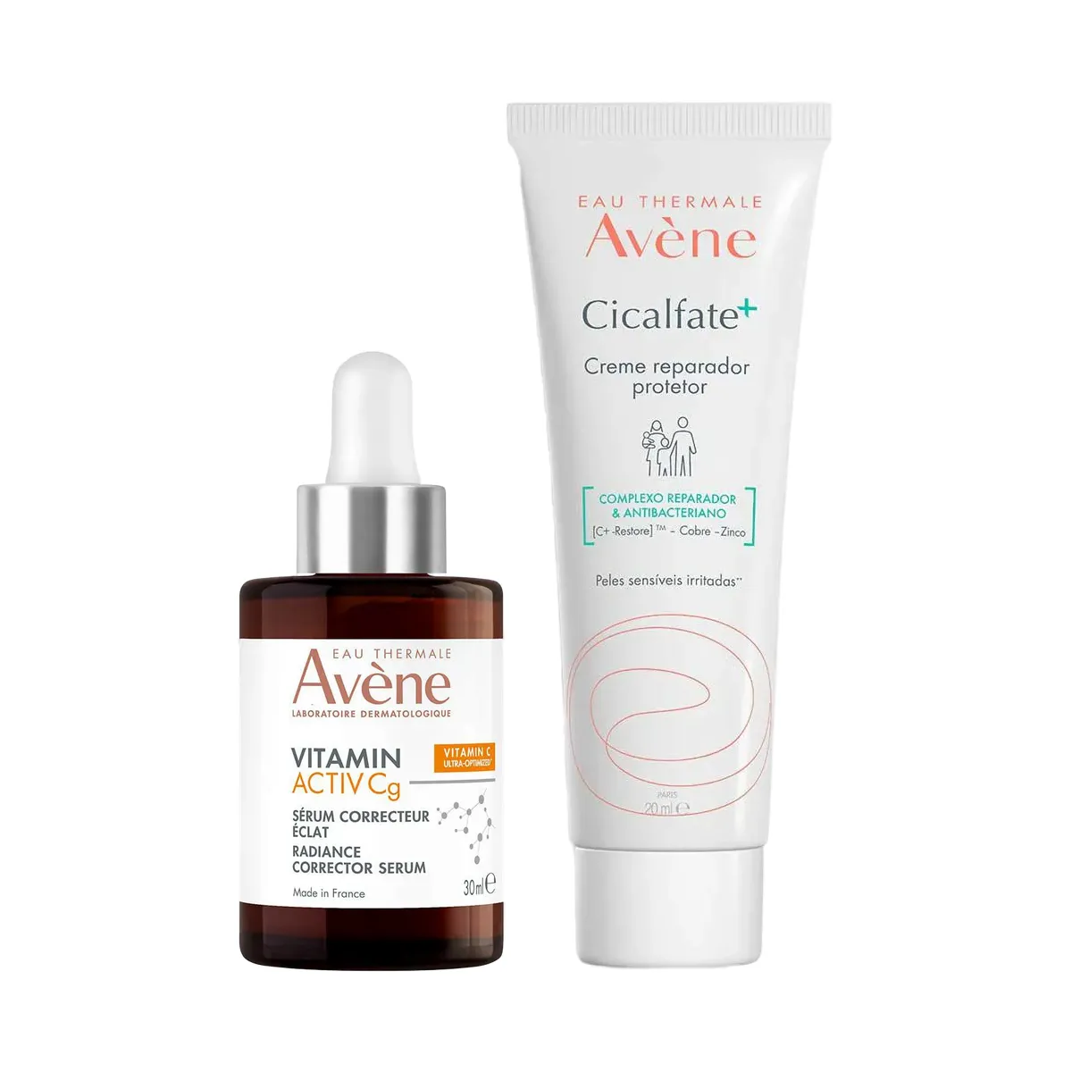 O Avène Vitamin Activ Cg Sérum é um produto cosmético facial com tecnologia de pró vitamina C, desenvolvido para cuidados com a pele. Possui uma fórmula exclusiva que combina Vitamina Cg, Niacinamida e Bakuchiol, com textura não oleosa e de rápida absorção, sendo adaptado para todos os tipos de pele e testado em peles sensíveis. O Cicalfate é um creme hidratante reparador intensivo com ação antibacteriana, indicado para acelerar o processo de reparação natural da pele no caso de lesões e prevenir a proliferação de bactérias durante seu uso. Ele possui uma textura creme que acaba formando uma capa de proteção nas lesões, mantendo o local sempre protegido.