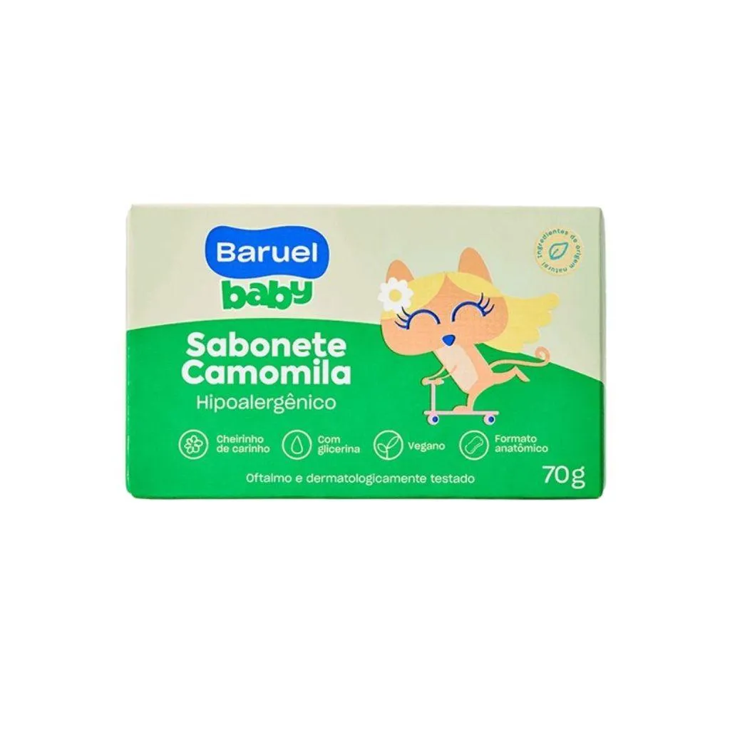 O Sabonete Baruel Baby Camomila é um produto de limpeza corporal desenvolvido para a pele sensível de bebês. Sua função é realizar uma limpeza suave e delicada, hidratando a pele e proporcionando cuidado e conforto durante o banho.