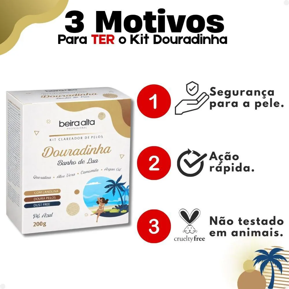 O Kit Clareador de Pelos Douradinha é um conjunto de produtos cosméticos desenvolvido para clarear os pelos do corpo, composto por pó descolorante, água oxigenada cremosa, óleo de amêndoas, luvas, bacia plástica e espátula.
