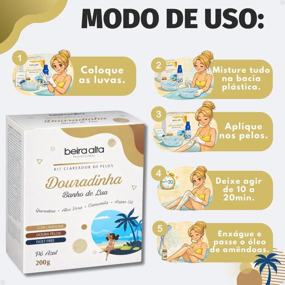 Como usar o Kit Beira Alta Clareador De Pelos Douradinha Banho De Lua 200G?