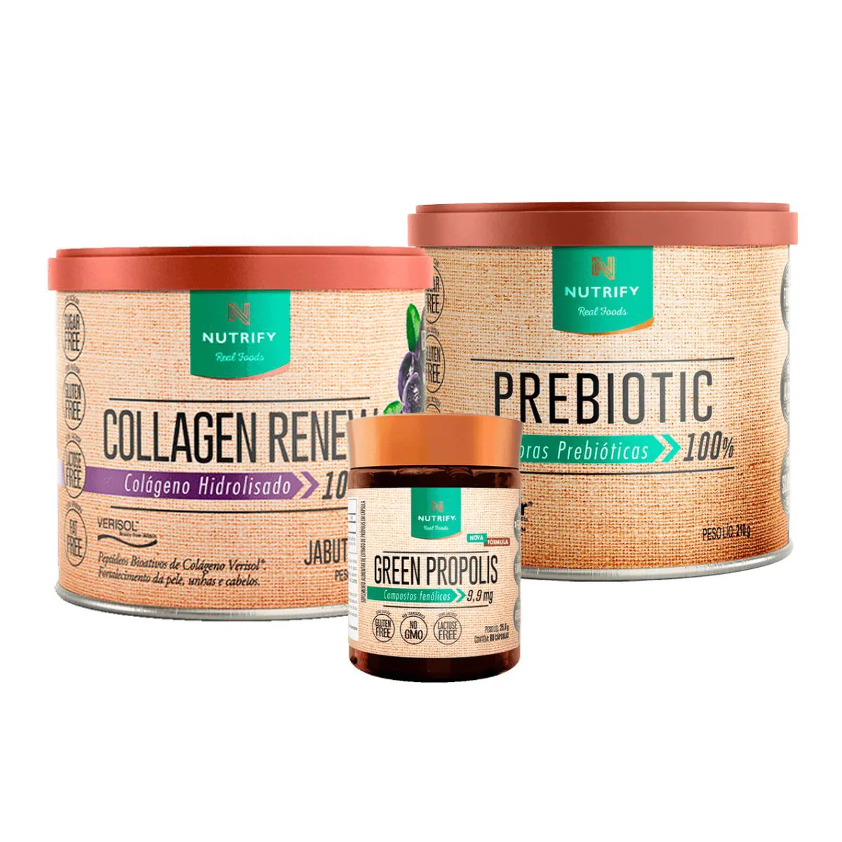 O Kit beleza e Equilíbrio da Nutrify contém: 1 - Collagen Renew - Sabor Jabuticaba 1- Prebiotic 1- Green Própolis