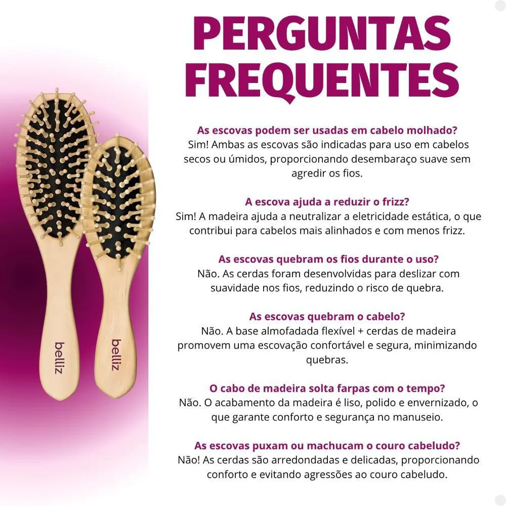 Descubra a versatilidade e o cuidado que o Kit Belliz Escova Madeira oferece para seus cabelos. Desenvolvido pela BELLIZ COMPANY, este conjunto é a solução ideal para quem busca praticidade e eficiência no dia a dia. Composto por duas escovas essenciais, ele atende a diversas necessidades, desde desembaraçar suavemente até finalizar penteados.Este kit foi pensado para proporcionar uma experiência completa de cuidado capilar, garantindo fios mais saudáveis e bem cuidados. Invista na qualidade e na durabilidade da madeira para um toque natural em sua rotina de beleza.Benefícios Principais:Versatilidade para diferentes tipos de cabelo e necessidades de penteado.Facilita o desembaraço suave, minimizando a quebra dos fios.Ideal para uso diário, proporcionando praticidade e eficiência.Contribui para um cabelo mais alinhado e com aspecto saudável.Diferenciais do Produto:Construção em madeira de alta qualidade, oferecendo durabilidade e um toque natural.Combinação estratégica de duas escovas (uma oval e uma pequena) para atender a todas as suas necessidades.Design ergonômico que proporciona conforto durante o uso.Produto da renomada BELLIZ COMPANY, sinônimo de confiança e excelência em acessórios de beleza.Ocasiões de Uso e Cenários Ideais:Perfeito para a rotina diária de cuidados com os cabelos, seja em casa ou em viagens.A escova oval é ideal para desembaraçar e pentear grandes mechas, enquanto a pequena é excelente para detalhes e franjas.Essencial para manter a saúde e a beleza dos fios em qualquer momento.