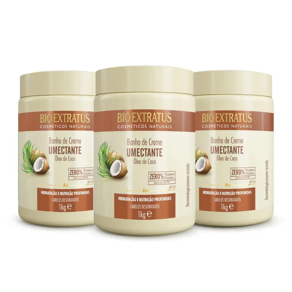 O Kit Bio Extratus Banho De Creme Umectante é um conjunto de 3 unidades de um produto capilar desenvolvido para hidratação e nutrição profunda dos cabelos. É uma fórmula antirressecamento com alto poder umectante, que age na fibra capilar de dentro para fora, utilizando ingredientes como óleo de coco e aminoácidos vegetais.