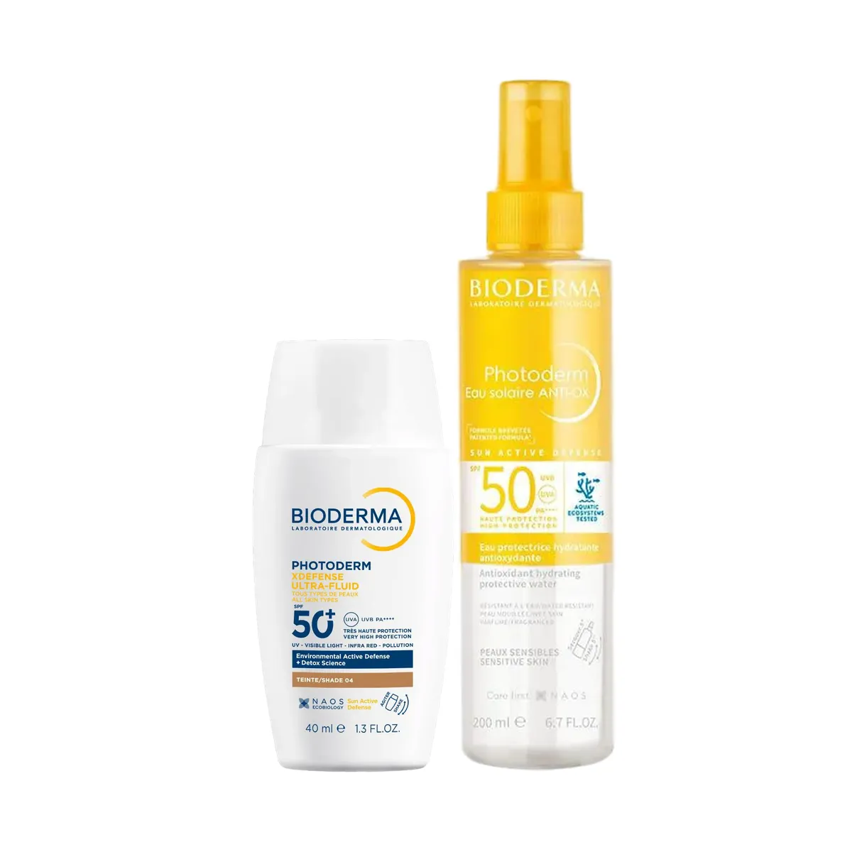 O Kit Bioderma Photoderm Protetor Solar Facial XDefense FPS 50+ é um fotoprotetor diário ultrafluido, com textura leve e acabamento ultra seco, desenvolvido para oferecer proteção completa contra radiações solares, luz visível, infravermelhos, poluição e radicais livres, sendo adequado para todos os tipos de pele, inclusive peles oleosas e sensíveis. O Photoderm Eau Solaire Anti-OX é um inovador antioxidante corporal bifásico com fotoproteção FPS50+ e uma fórmula exclusiva com ANTI-OX ACTIVE*, complexo antioxidante 10x mais potente que a vitamina e que aumenta em 61% a proteção logo após a aplicação. Indicado para rosto, corpo e cabelo, o Photoderm Eau Solaire Anti-OX previne o fotoenvelhecimento e danos solares e conta com uma textura ultraleve de rápida absorção e refrescante à base de água que garante a sensação de pele nua, sem deixar resíduos, marcas e sensação pegajosa.