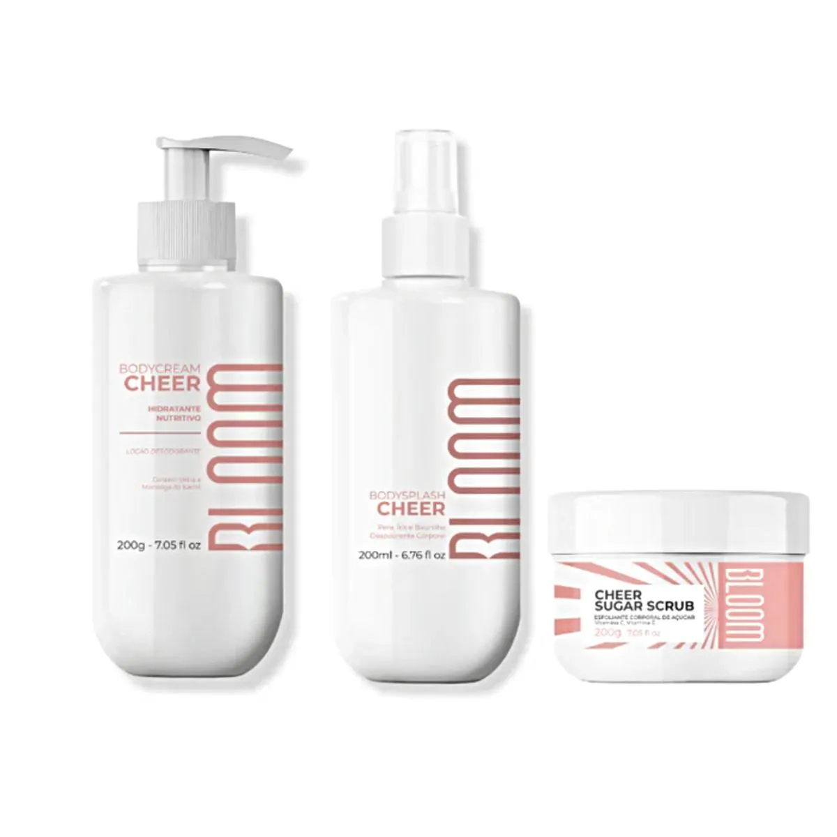 Kit Bloom Cheer Body Splash 200ml+ Body Cream Loção Desodorante Hidratante Corporal 200g+ Esfoliante 200g Uma rotina de cuidados que transforma a pele e eleva os sentidos. O Kit Cheer traz esfoliação, hidratação intensa e uma fragrância alegre, feminina e marcante. Esfoliação suave com vitaminas antioxidantes para uma pele renovada Hidratação profunda com manteiga de karité e ureia Fragrância com alta fixação e notas marcantes, ideal para uso diário Pirâmide Olfativa: