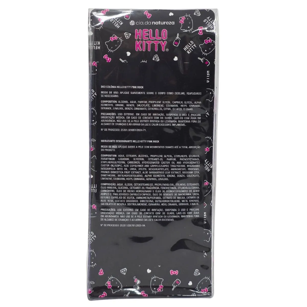 É um conjunto de produtos cosméticos da linha Hello Kitty, composto por um Body Splash e um Hidratante Corpo e Rosto, com fragrância de âmbar floral e notas de melão, maçã, bergamota, baunilha, sândalo e cedro.