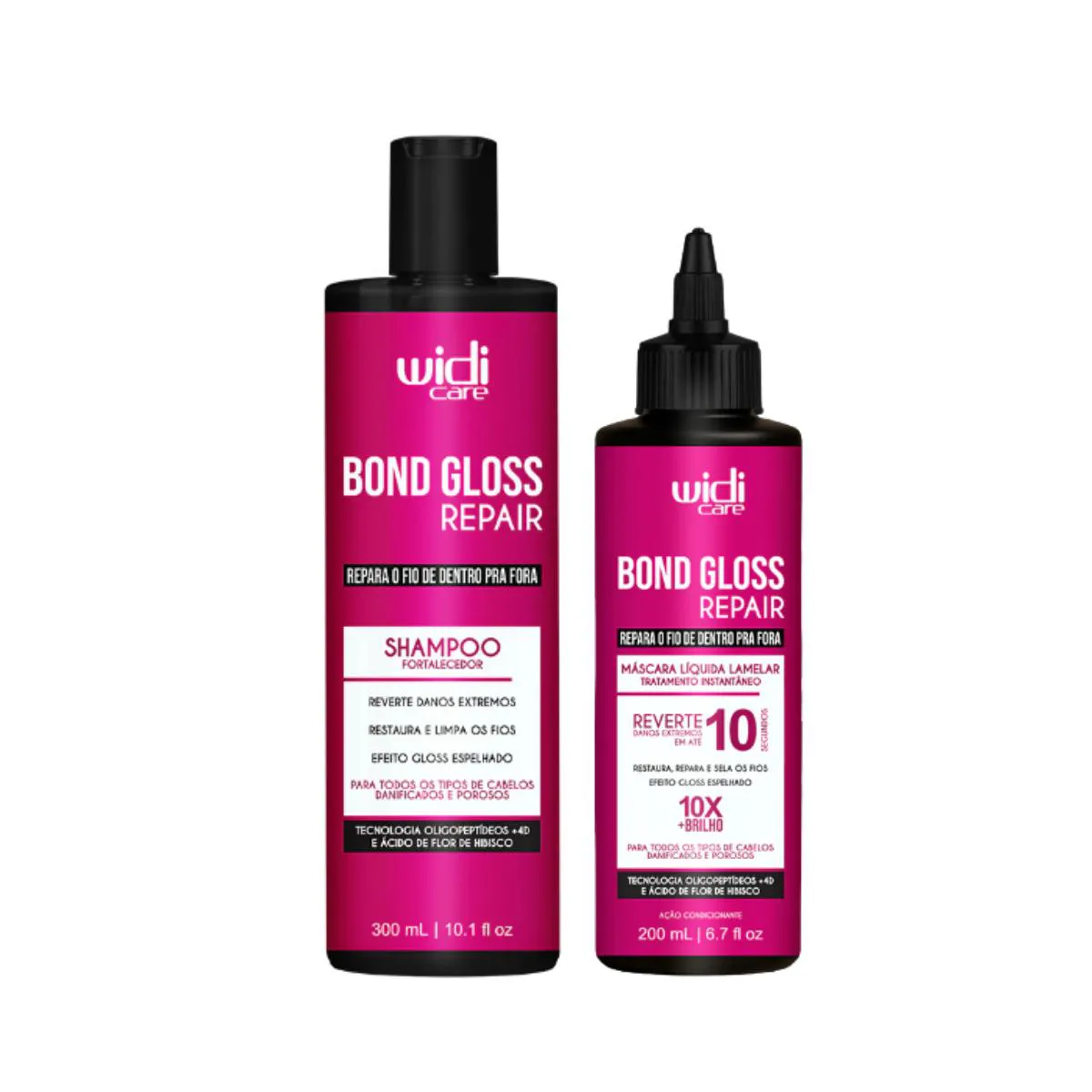 Kit Bond Gloss Repair - shampoo 300ml e máscara Líquida 200ml - Widi Care O kit contém: Bond Gloss Repair Shampoo fortalecedor 300ml - Widi Care Descrição: O SHAMPOO BOND GLOSS REPAIR Widi Care traz uma fórmula inovadora com Oligopeptídeos +4D e Ácido de Flor de Hibisco, que limpa suavemente e fortalece a estrutura molecular da fibra capilar, revertendo danos extremos no córtex, a parte mais profunda do fio, deixando os fios reparados e saudáveis. Ideal para todos os tipos de cabelos danificados e porosos, este é o primeiro passo da sua rotina de cuidado capilar para uma transformação inteligente dos fios. Modo de Uso: Aplique sobre os cabelos molhados, massageando o couro cabeludo para obter uma espuma cremosa. Deixe agir enquanto espalha a espuma por todo o comprimento do cabelo. Se necessário, repita a aplicação. Enxágue bem, e a seguir aplique a Máscara Líquida Widi Care Bond Gloss Repair. Uso diário. Use a linha Bond Gloss Repair para melhores resultados. Bond Gloss Repair Máscara Líquida Lamelar Ação Condicionante 200ml - Widi Care Descrição: O Sérum Reconstrutor Widi Care traz uma fórmula inovadora com Oligopeptídeos +4D e Ácido de Flor de Hibisco, que penetra até o córtex, a parte mais profunda do fio, reconstruindo ligações capilares quebradas, restaurando a estrutura interna dos cabelos e devolvendo brilho intenso e visível. Ideal para todos os tipos de cabelos danificados e porosos, o sérum prolonga o efeito do tratamento e protege os fios contra novas agressões. • Reverte danos extremos • Restaura, sela e blinda os fios • Repara pontas duplas • Efeito gloss espelhado Modo de Uso: Após lavar os cabelos com o shampoo Bond Gloss Repair WIdi Care, aplique uma pequena quantidade da Máscara Líquida nos cabelos molhados. Enluve e massageie todo o comprimento dos fios por 10 segundos. Ao massagear, você irá perceber um creme se formando e um leve aquecimento do produto. Enxágue. Se você sentir necessidade, utilize o Leave-in 2 em 1 Bond Gloss Repair, para condicionador e/ou finalizar os fios. Uso diário. Use a linha Bond Gloss Repair para melhores resultados.