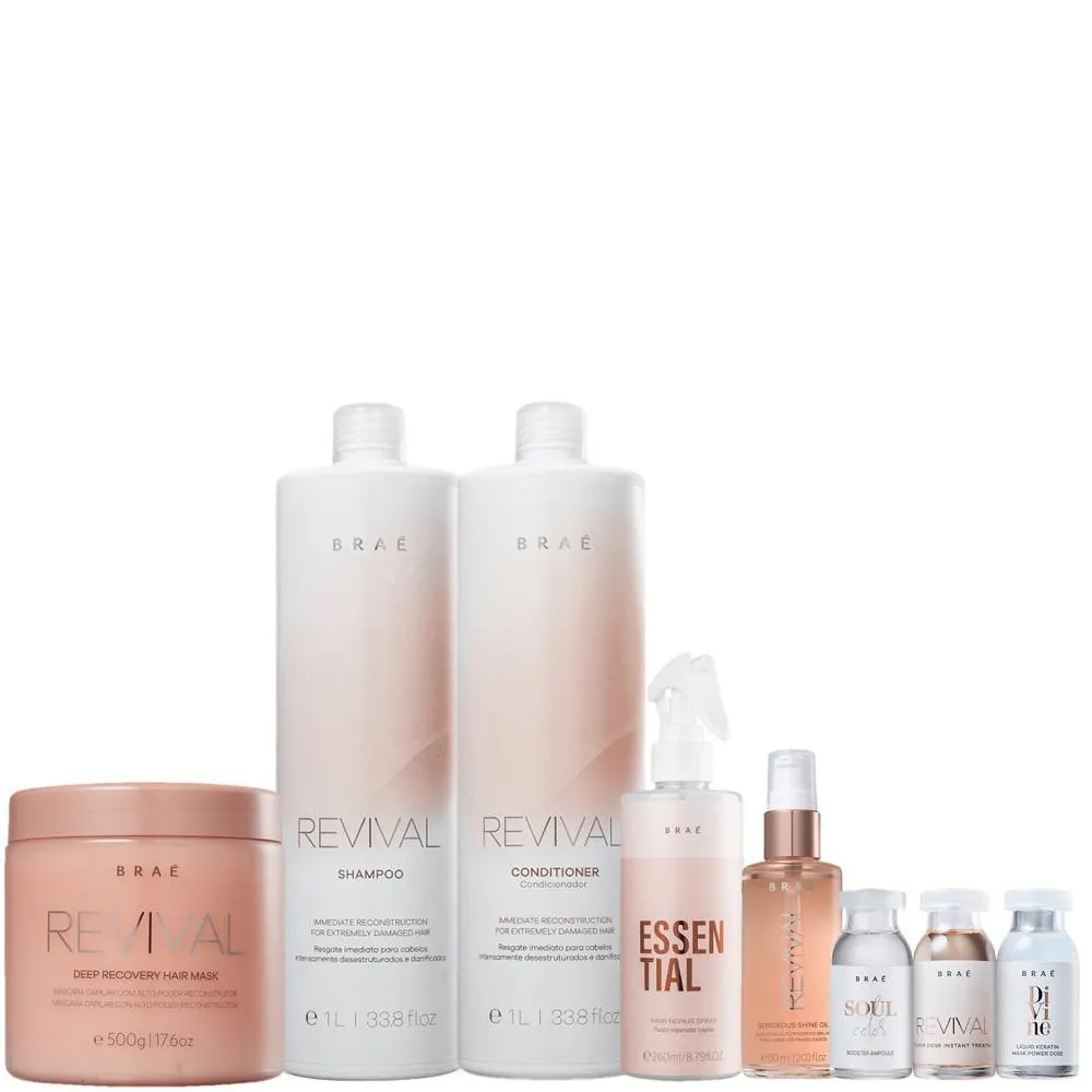 Este Kit Contém BRAÉ Revival - shampoo 1L: limpa e ajuda na recuperação dos fios desestruturados.