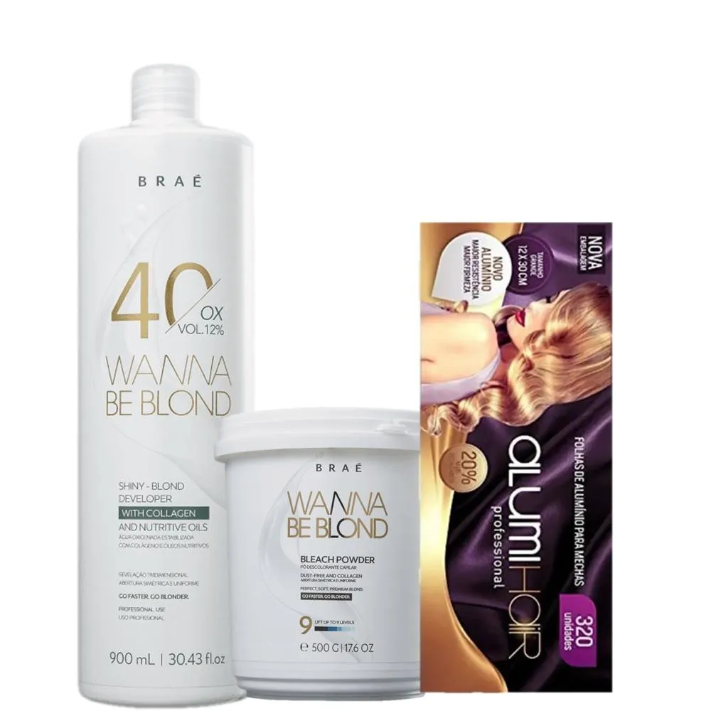 A Linha Braé Wanna Be Blond conta com oxidantes e descolorantes formulados especialmente para clarear a fibra capilar de maneira rápida, uniforme e sem grandes danos à estrutura do fio. Este Kit ContémBRAÉ Wanna Be Blond 40 - Água Oxigenada 40 Volumes 900ml: clareia até 4 tons para revelar loiros platinados ou clarear fios escuros naturalmente. Ilumina tons de maneira uniforme e age harmoniosamente com o descolorante Wanna Be Blond. BRAÉ Wanna Be Sua fórmula conta com colágeno que preserva a fibra capilar durante a descoloração, para que não fique muito danificada. Também conta com blend de óleos que deixa os fios macios, com brilho e maleabilidade. BRAÉ Wanna Be Blond 9% - Pó Descolorante 500g: clareia até 9 tons de maneira uniforme, deixando os fios com aspecto incrível. Possui fórmula rica em colágeno que preserva o fio, para que você consiga tons altos sem comprometer a saúde do fio. Ainda conta com tecnologia que proporciona um cabelo macio, com brilho e maleável após a descoloração. Ideal para clareamentos completos ou mechas pontuais. Alumi Hair - Folhas de Alumínio (320 Unidades): produto moderno e inteligente, que veio para facilitar o trabalho do cabeleireiro. Como Usar Conselho de Aplicação Pó Descolorante: 1. Adicione o pó descolorante no oxidante;2. Misture até obter um creme homogêneo e aplique sobre os cabelos secos;