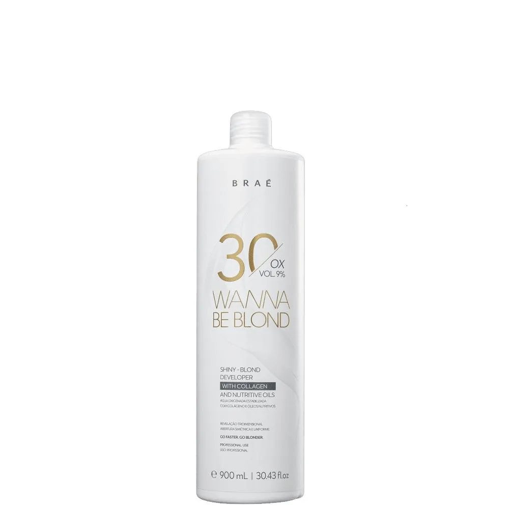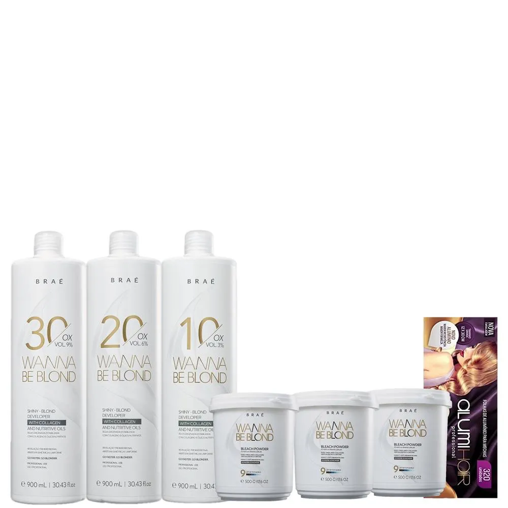A Linha Braé Wanna Be Blond conta com oxidantes e descolorantes formulados especialmente para clarear a fibra capilar de maneira rápida, uniforme e sem grandes danos à estrutura do fio. Este Kit ContémBRAÉ Wanna Be Blond - Águas Oxigenadas 10, 20, 30 Volumes 900ml: clareia até 4 tons para revelar loiros platinados ou clarear fios escuros naturalmente. Ilumina tons de maneira uniforme e age harmoniosamente com o descolorante Wanna Be Blond. BRAÉ Wanna Be Sua fórmula conta com colágeno que preserva a fibra capilar durante a descoloração, para que não fique muito danificada. Também conta com blend de óleos que deixa os fios macios, com brilho e maleabilidade. BRAÉ Wanna Be Blond 9% - Pó Descolorante 500g: clareia até 9 tons de maneira uniforme, deixando os fios com aspecto incrível. Possui fórmula rica em colágeno que preserva o fio, para que você consiga tons altos sem comprometer a saúde do fio. Ainda conta com tecnologia que proporciona um cabelo macio, com brilho e maleável após a descoloração. Ideal para clareamentos completos ou mechas pontuais. Alumi Hair - Folhas de Alumínio (320 Unidades): produto moderno e inteligente, que veio para facilitar o trabalho do cabeleireiro. Como Usar Conselho de Aplicação Ox: 1 -Adicione o pó descolorante Wanna Be Blond e o OxidanteWanna Be Blond na proporção 1+1 / 1+1 ½ / 1+2 até 1+3