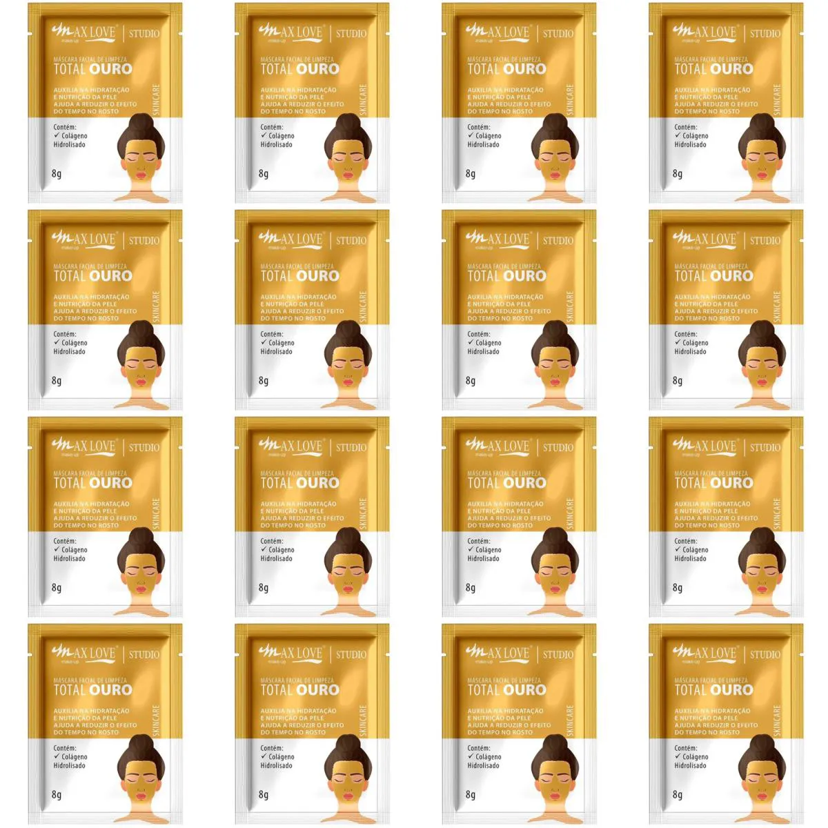 Kit c/16 máscara facial Peel Off 8g Ouro Max Love.