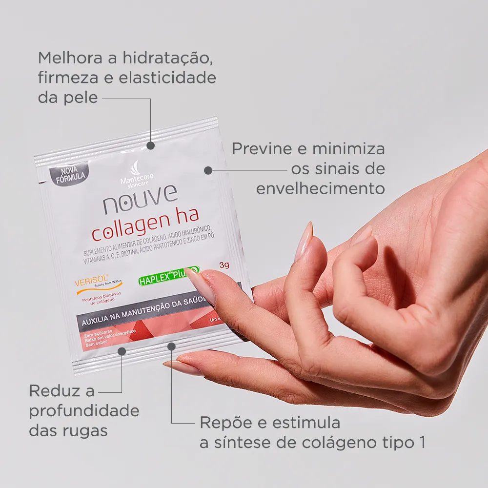 - Suplemento com colágeno VERISOL e ácido hialurônico.